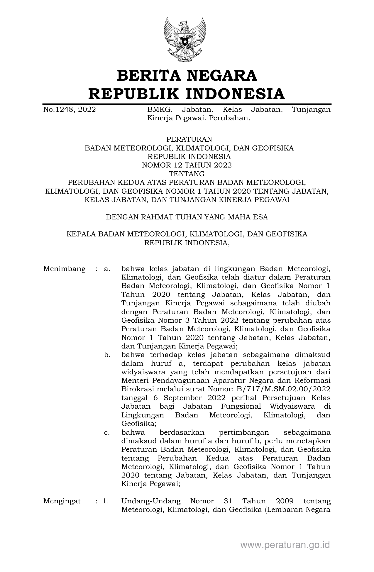 PERBAN Nomor 12 Tahun 2022 | Peraturan Badan Nomor 12 Tahun 2022 tentang PERUBAHAN KEDUA ATAS PERATURAN BADAN METEOROLOGI, KLIMATOLOGI, DAN GEOFISIKA NOMOR 1 TAHUN 2020 TENTANG JABATAN, KELAS JABATAN, DAN TUNJANGAN KINERJA PEGAWAI
