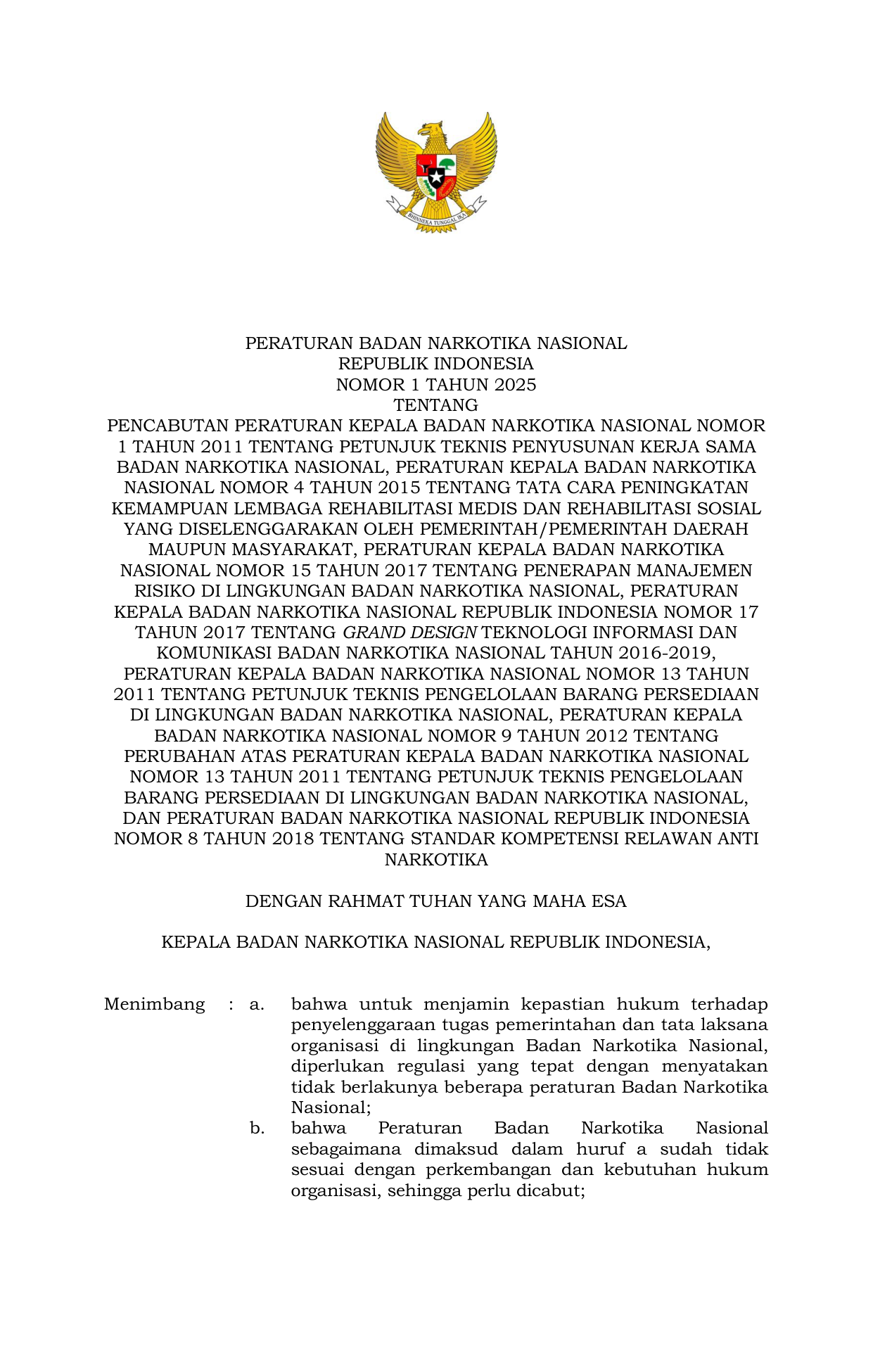 PERBAN Nomor 1 Tahun 2025 | Peraturan Badan Nomor 1 Tahun 2025 tentang PENCABUTAN PERATURAN KEPALA BADAN NARKOTIKA NASIONAL NOMOR 1 TAHUN 2011 TENTANG PETUNJUK TEKNIS PENYUSUNAN KERJA SAMA BADAN NARKOTIKA NASIONAL PERATURAN KEPALA BADAN NARKOTIKA NASIONAL NOMOR 4 TAHUN 2015 TENTANG TATA CARA PENINGKATAN KEMAMPUAN LEMBAGA REHABILITASI MEDIS DAN REHABILITASI SOSIAL YANG DISELENGGARAKAN OLEH PEMERINTAH PEMERINTAH DAERAH MAUPUN MASYARAKAT PERATURAN KEPALA BADAN NARKOTIKA NASIONAL NOMOR 15 TAHUN 2017 TENTANG PENERAPAN MANAJEMEN RISIKO DI LINGKUNGAN BADAN NARKOTIKA NASIONAL PERATURAN KEPALA BADAN NARKOTIKA NASIONAL REPUBLIK INDONESIA NOMOR 17 TAHUN 2017 TENTANG GRAND DESIGN TEKNOLOGI INFORMASI DAN KOMUNIKASI BADAN NARKOTIKA NASIONAL TAHUN 2016 2019 PERATURAN KEPALA BADAN NARKOTIKA NASIONAL NOMOR 13 TAHUN 2011 TENTANG PETUNJUK TEKNIS PENGELOLAAN BARANG PERSEDIAAN DI LINGKUNGAN BADAN NARKOTIKA NASIONAL PERATURAN KEPALA BADAN NARKOTIKA NASIONAL NOMOR 9 TAHUN 2012 TENTANG PERUBAHAN ATAS