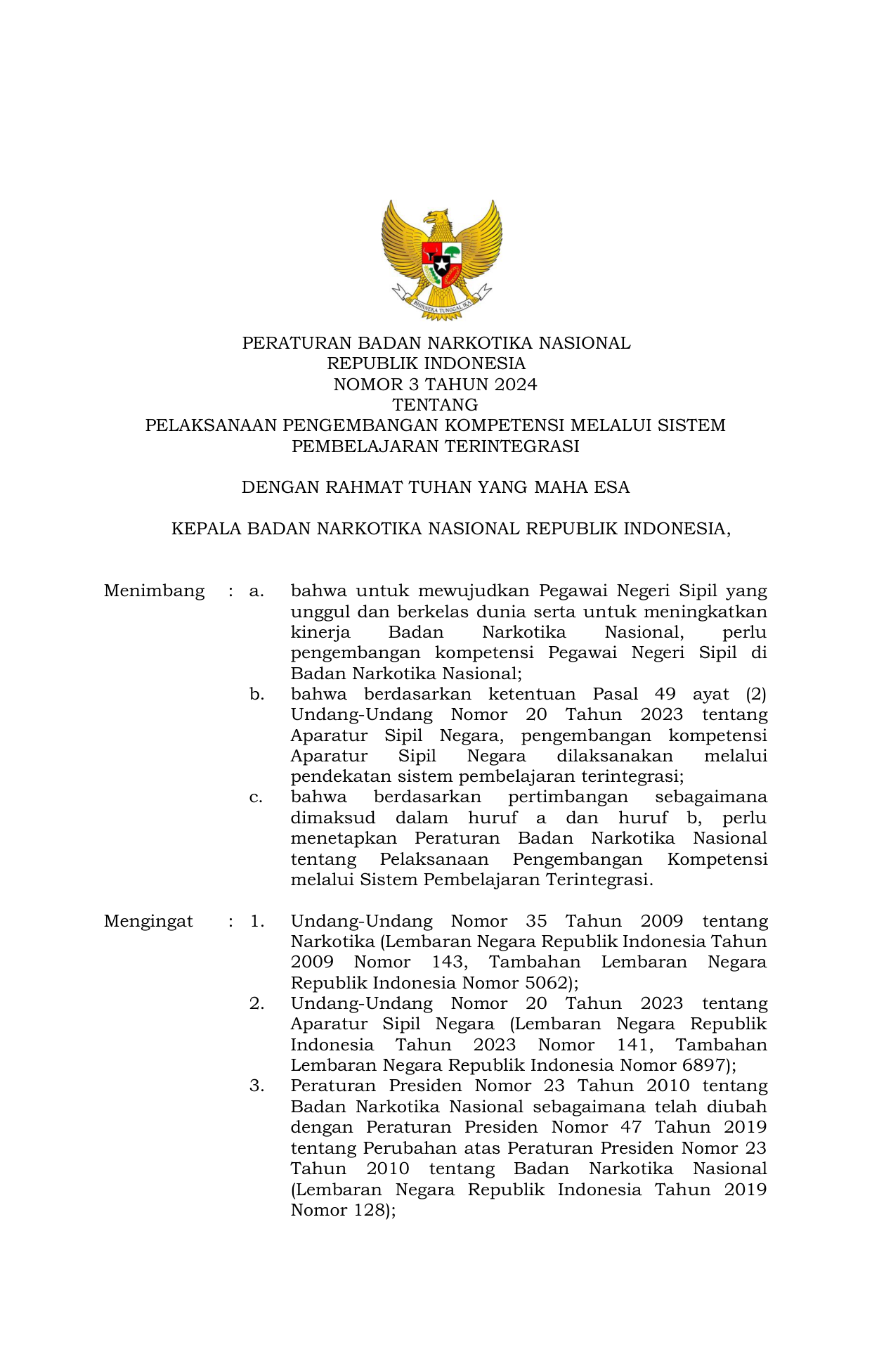 PERBAN Nomor 3 Tahun 2024 | Peraturan Badan Nomor 3 Tahun 2024 tentang PELAKSANAAN PENGEMBANGAN KOMPETENSI MELALUI SISTEM PEMBELAJARAN TERINTEGRASI