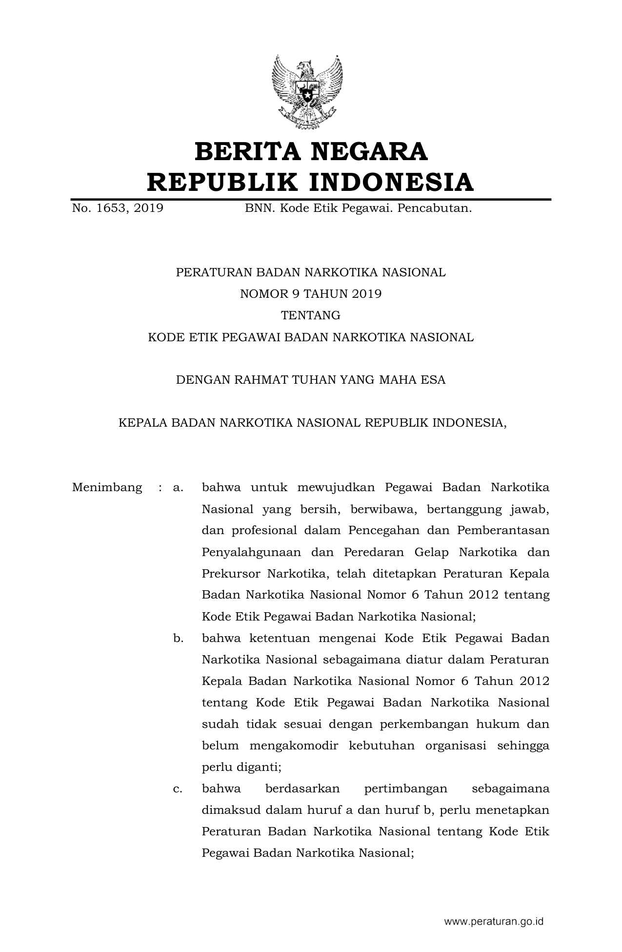 PERBAN Nomor 9 Tahun 2019 | Peraturan Badan Nomor 9 Tahun 2019 tentang KODE ETIK PEGAWAI BADAN NARKOTIKA NASIONAL