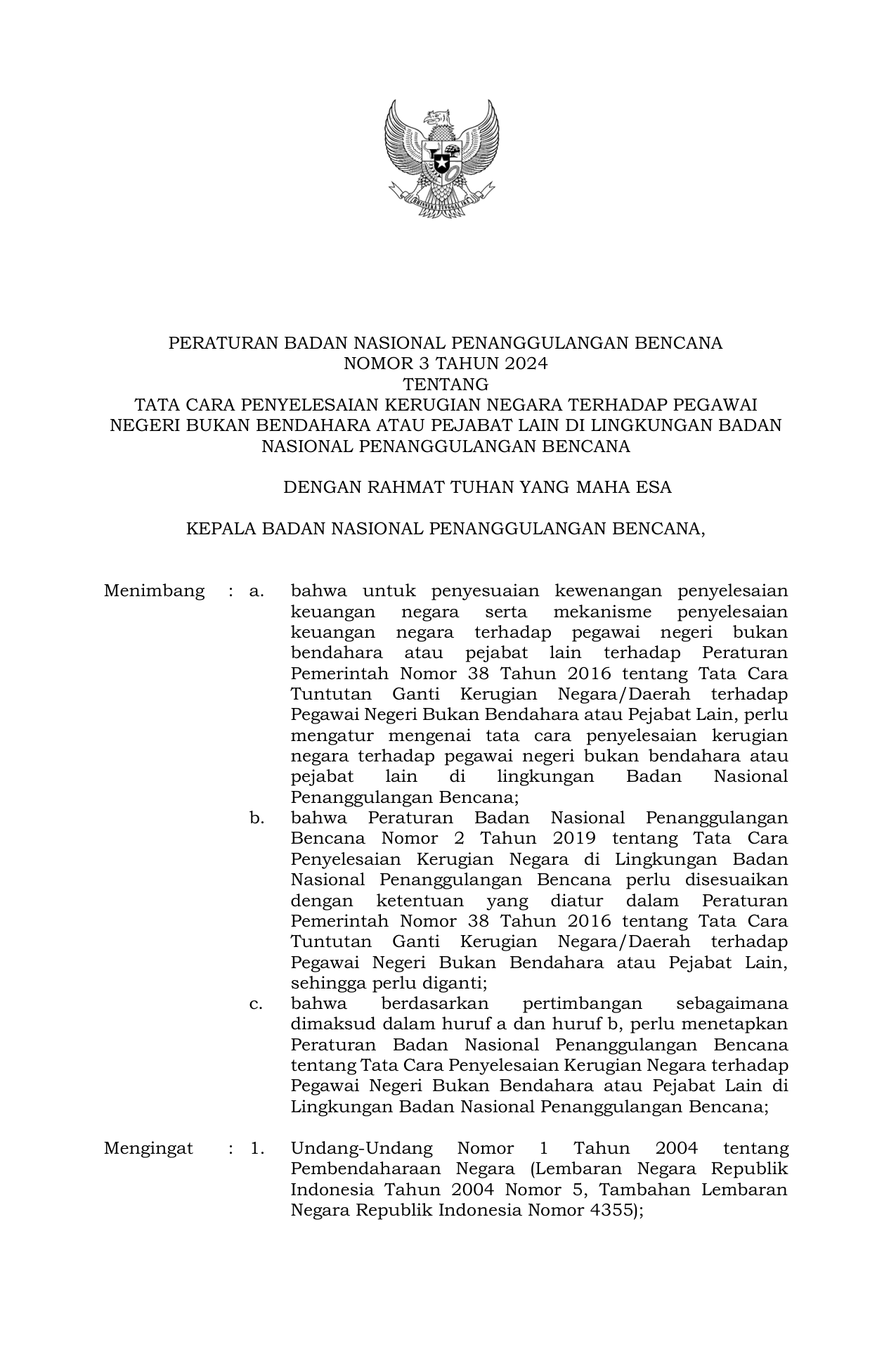 PERBAN Nomor 3 Tahun 2024 | Peraturan Badan Nomor 3 Tahun 2024 tentang Tata Cara Penyelesaian Kerugian Negara Terhadap Pegawai Negeri Bukan Bendahara atau Pejabat Lain di Lingkungan Badan Nasional Penanggulangan Bencana