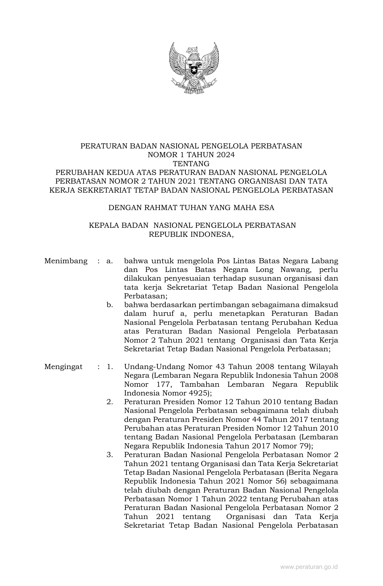 PERBAN Nomor 1 Tahun 2024 | Peraturan Badan Nomor 1 Tahun 2024 tentang PERUBAHAN KEDUA ATAS PERATURAN BADAN NASIONAL PENGELOLA PERBATASAN NOMOR 2 TAHUN 2021 TENTANG ORGANISASI DAN TATA KERJA SEKRETARIAT TETAP BADAN NASIONAL PENGELOLA PERBATASAN