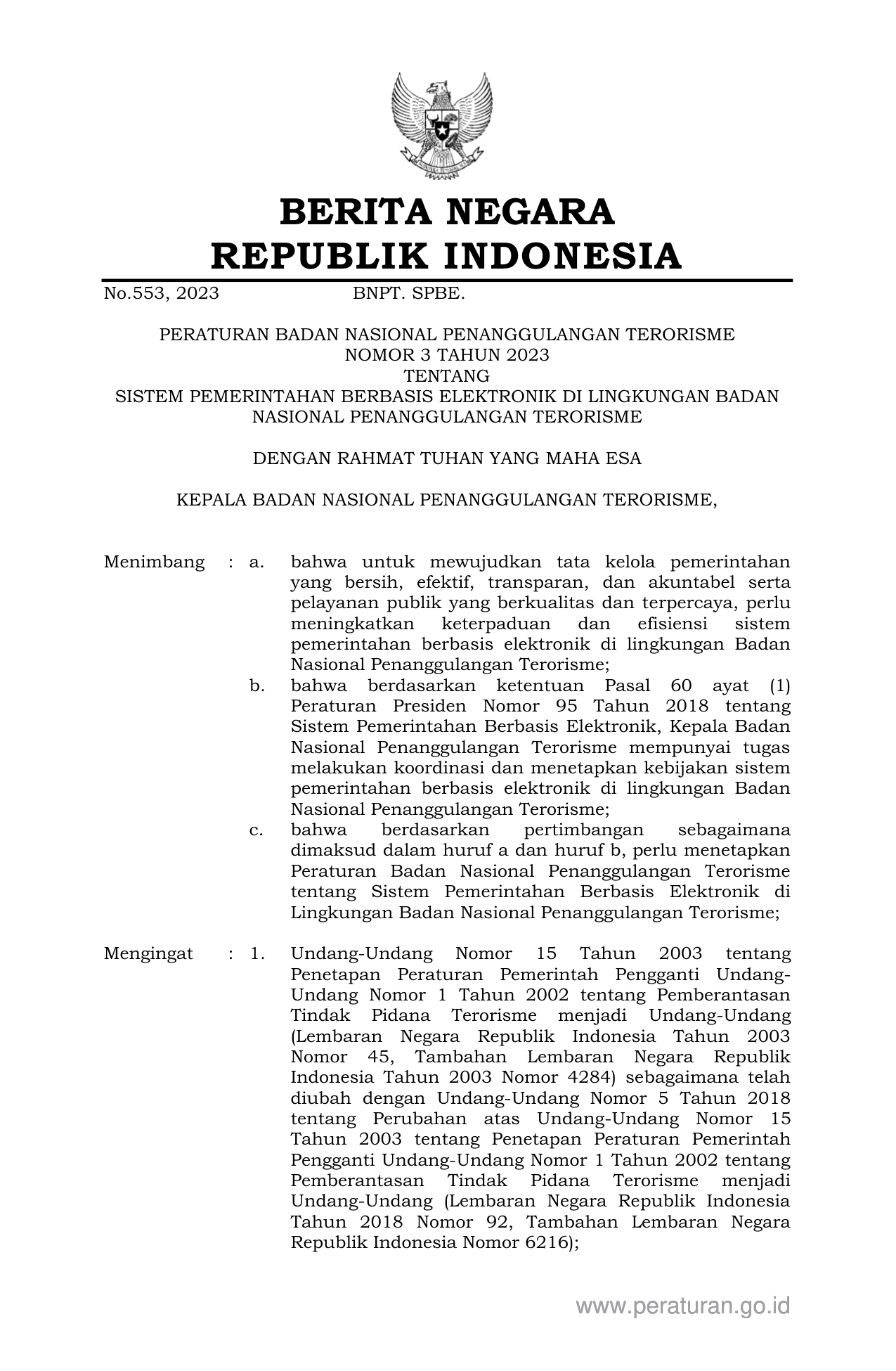 PERBAN Nomor 3 Tahun 2023 | Peraturan Badan Nomor 3 Tahun 2023 tentang SISTEM PEMERINTAHAN BERBASIS ELEKTRONIK DI LINGKUNGAN BADAN NASIONAL PENANGGULANGAN TERORISME