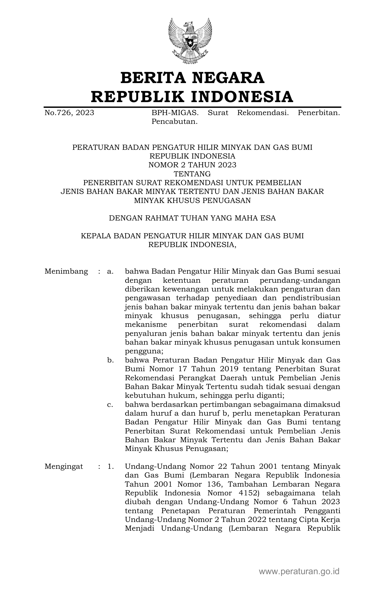 PERBAN Nomor 2 Tahun 2023 | Peraturan Badan Nomor 2 Tahun 2023 tentang PENERBITAN SURAT REKOMENDASI UNTUK PEMBELIAN JENIS BAHAN BAKAR MINYAK TERTENTU DAN JENIS BAHAN BAKAR MINYAK KHUSUS PENUGASAN