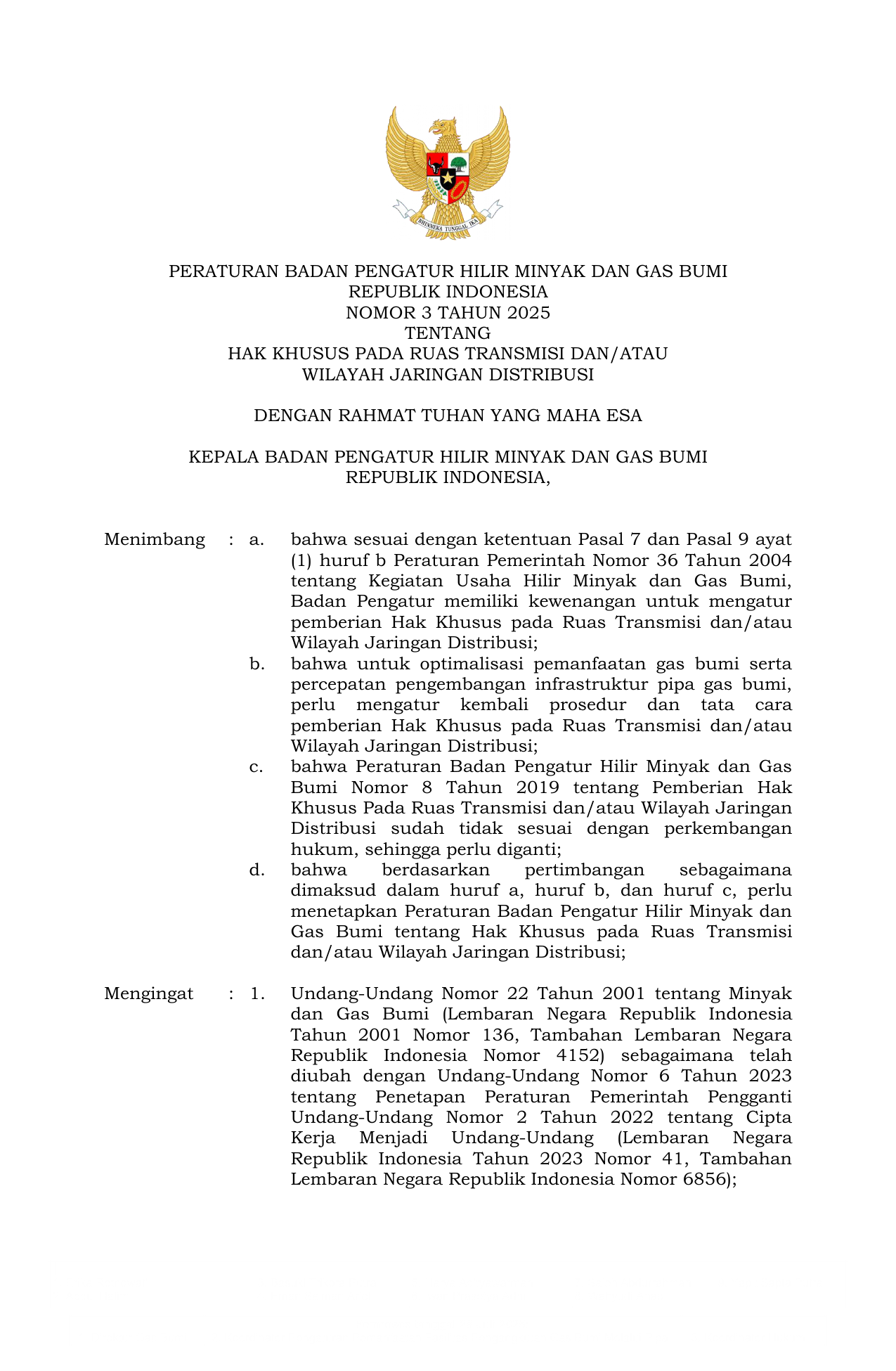 PERBAN Nomor 3 Tahun 2025 | Peraturan Badan Nomor 3 Tahun 2025 tentang Hak Khusus pada Ruas Transmisi danatau Wilayah Jaringan Distribusi