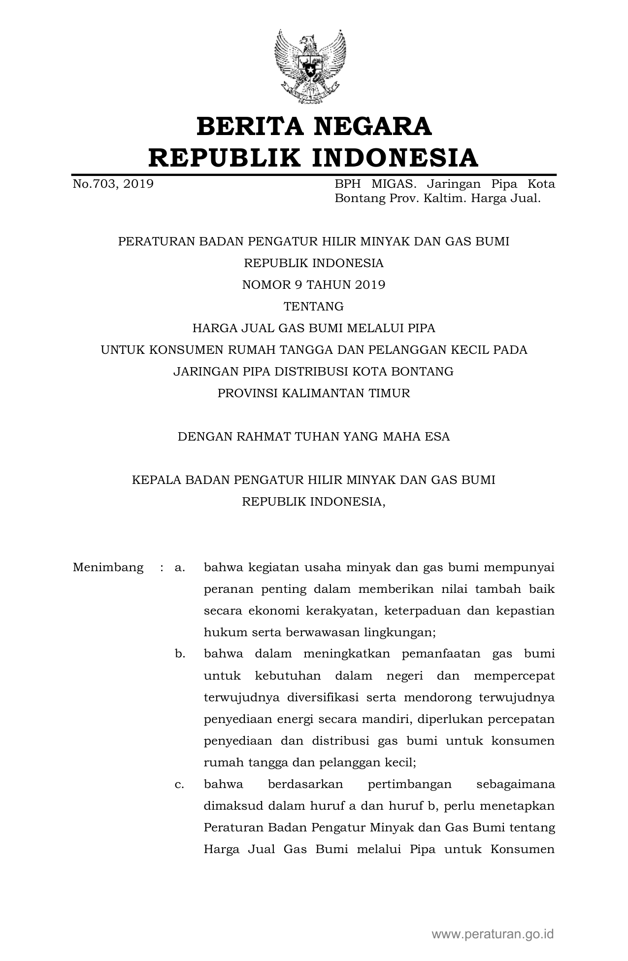 PERBAN Nomor 9 Tahun 2019 | Peraturan Badan Nomor 9 Tahun 2019 tentang HARGA JUAL GAS BUMI MELALUI PIPA UNTUK KONSUMEN RUMAH TANGGA DAN PELANGGAN KECIL PADA JARINGAN PIPA DISTRIBUSI KOTA BONTANG PROVINSI KALIMANTAN TIMUR