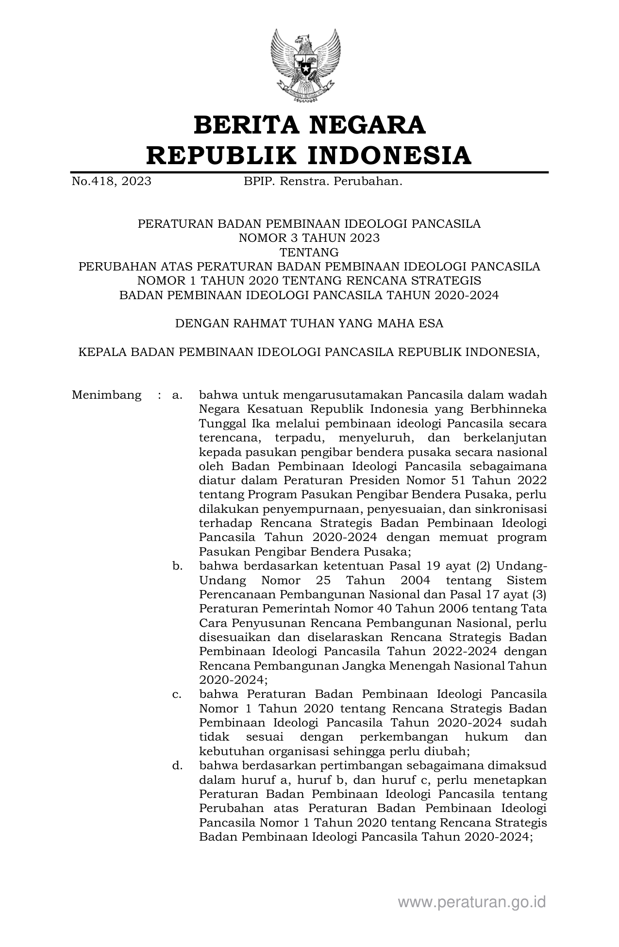PERBAN Nomor 3 Tahun 2023 | Peraturan Badan Nomor 3 Tahun 2023 tentang PERUBAHAN ATAS PERATURAN BADAN PEMBINAAN IDEOLOGI PANCASILA NOMOR 1 TAHUN 2020 TENTANG RENCANA STRATEGIS BADAN PEMBINAAN IDEOLOGI PANCASILA TAHUN 2020-2024