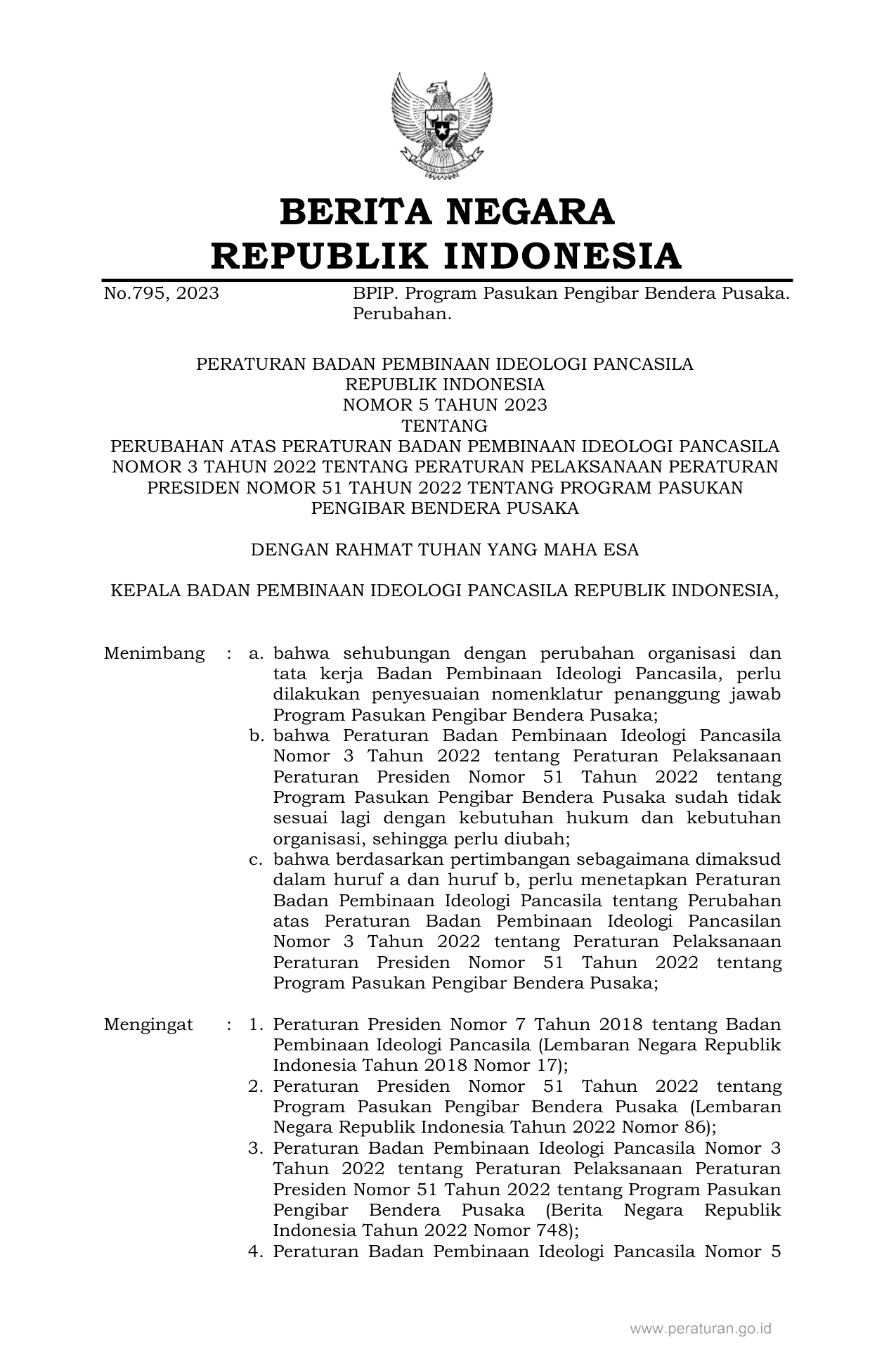 PERBAN Nomor 5 Tahun 2023 | Peraturan Badan Nomor 5 Tahun 2023 tentang PERUBAHAN ATAS PERATURAN BADAN PEMBINAAN IDEOLOGI PANCASILA NOMOR 3 TAHUN 2022 TENTANG PERATURAN PELAKSANAAN PERATURAN PRESIDEN NOMOR 51 TAHUN 2022 TENTANG PROGRAM PASUKAN PENGIBAR BENDERA PUSAKA