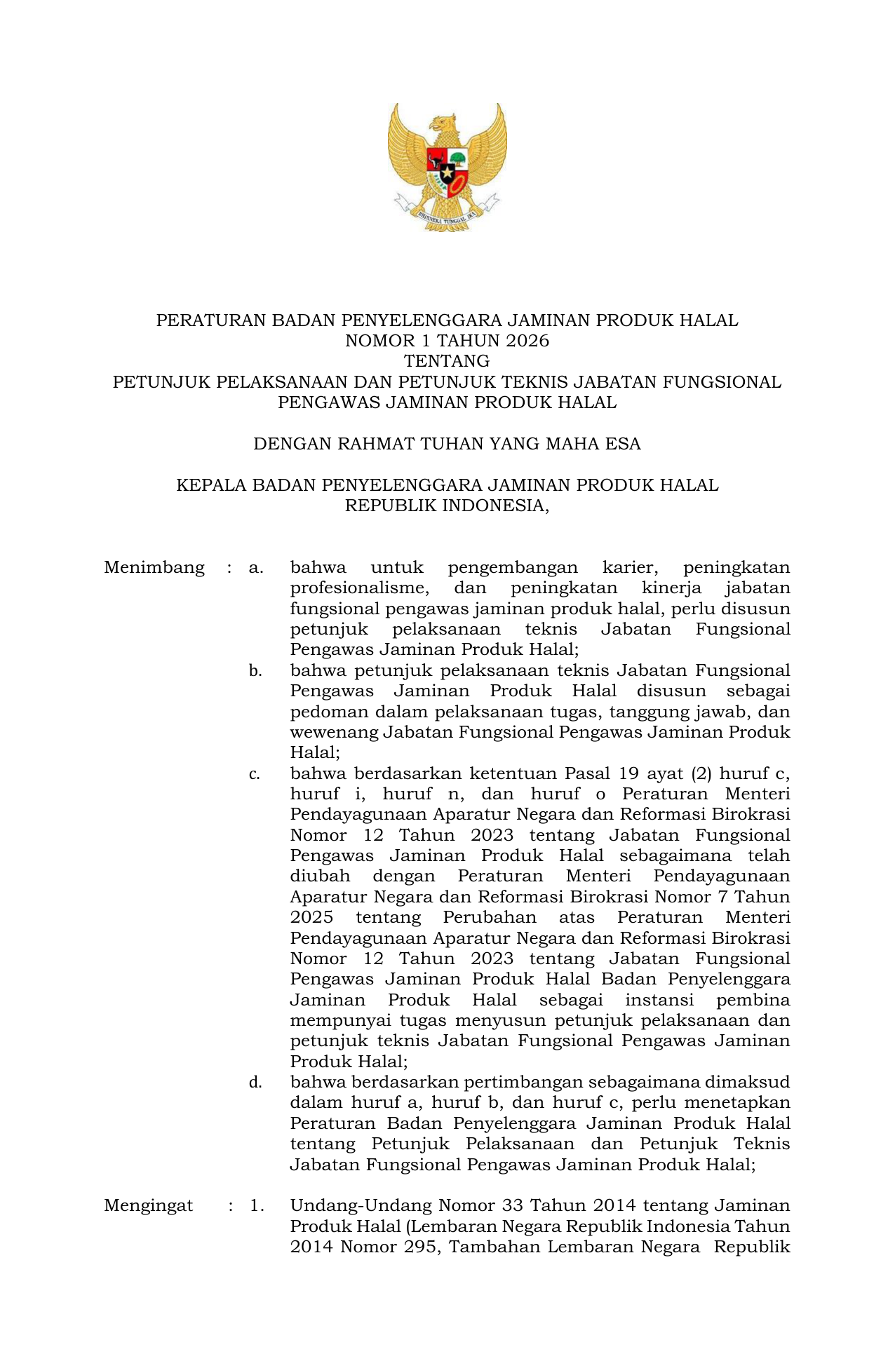 PERBAN Nomor 1 Tahun 2026 | Peraturan Badan Nomor 1 Tahun 2026 tentang Petunjuk Pelaksanaan dan Petunjuk Teknis Jabatan Fungsional Pengawas Jaminan Produk Halal