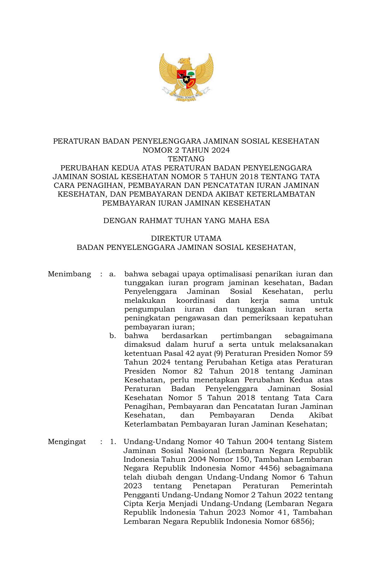 PERBAN Nomor 2 Tahun 2024 | Peraturan Badan Nomor 2 Tahun 2024 tentang PERUBAHAN KEDUA ATAS PERATURAN BADAN PENYELENGGARA JAMINAN SOSIAL KESEHATAN NOMOR 5 TAHUN 2018 TENTANG TATA CARA PENAGIHAN, PEMBAYARAN DAN PENCATATAN IURAN JAMINAN KESEHATAN, DAN PEMBAYARAN DENDA AKIBAT KETERLAMBATAN PEMBAYARAN IURAN JAMINAN KESEHATAN