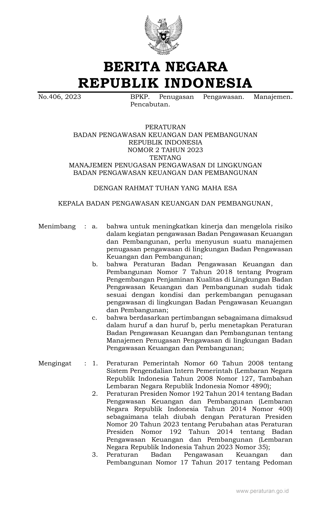 PERBAN Nomor 2 Tahun 2023 | Peraturan Badan Nomor 2 Tahun 2023 tentang MANAJEMEN PENUGASAN PENGAWASAN DI LINGKUNGAN BADAN PENGAWASAN KEUANGAN DAN PEMBANGUNAN