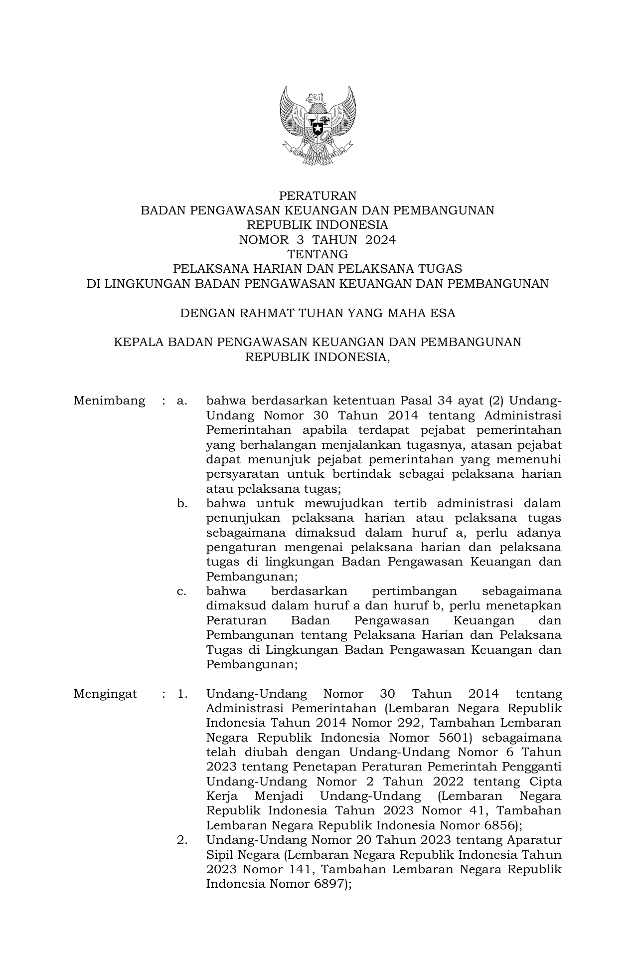 PERBAN Nomor 3 Tahun 2024 | Peraturan Badan Nomor 3 Tahun 2024 tentang Pelaksana Harian dan Pelaksana Tugas di Lingkungan Badan Pengawasan Keuangan dan Pembangunan
