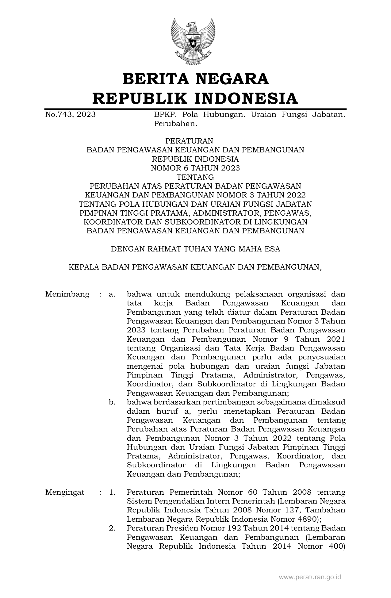 PERBAN Nomor 6 Tahun 2023 | Peraturan Badan Nomor 6 Tahun 2023 tentang PERUBAHAN ATAS PERATURAN BADAN PENGAWASAN KEUANGAN DAN PEMBANGUNAN NOMOR 3 TAHUN 2022 TENTANG POLA HUBUNGAN DAN URAIAN FUNGSI JABATAN PIMPINAN TINGGI PRATAMA, ADMINISTRATOR, PENGAWAS, KOORDINATOR DAN SUBKOORDINATOR DI LINGKUNGAN BADAN PENGAWASAN KEUANGAN DAN PEMBANGUNAN