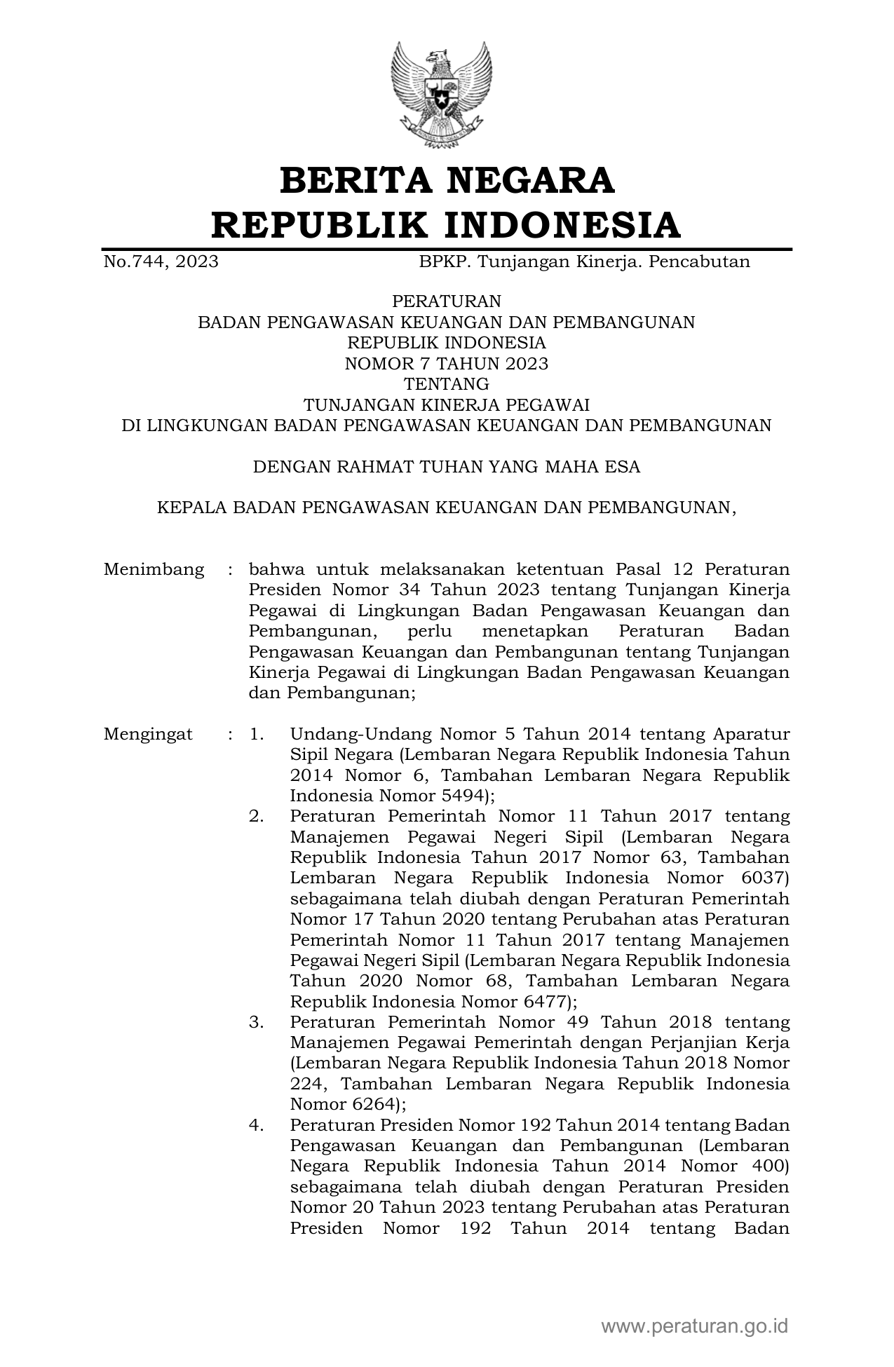 PERBAN Nomor 7 Tahun 2023 | Peraturan Badan Nomor 7 Tahun 2023 tentang TUNJANGAN KINERJA PEGAWAI DI LINGKUNGAN BADAN PENGAWASAN KEUANGAN DAN PEMBANGUNAN