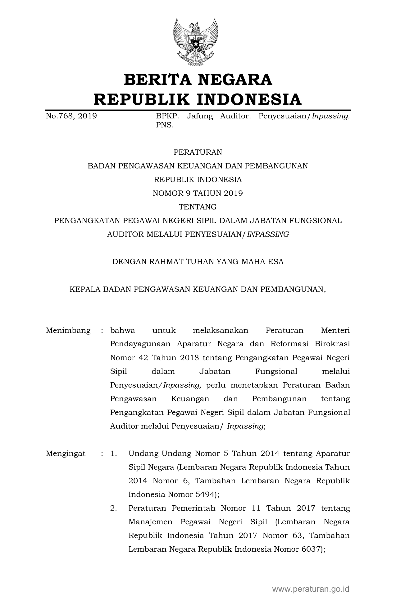 PERBAN Nomor 9 Tahun 2019 | Peraturan Badan Nomor 9 Tahun 2019 tentang PENGANGKATAN PEGAWAI NEGERI SIPIL DALAM JABATAN FUNGSIONAL AUDITOR MELALUI PENYESUAIAN/INPASSING
