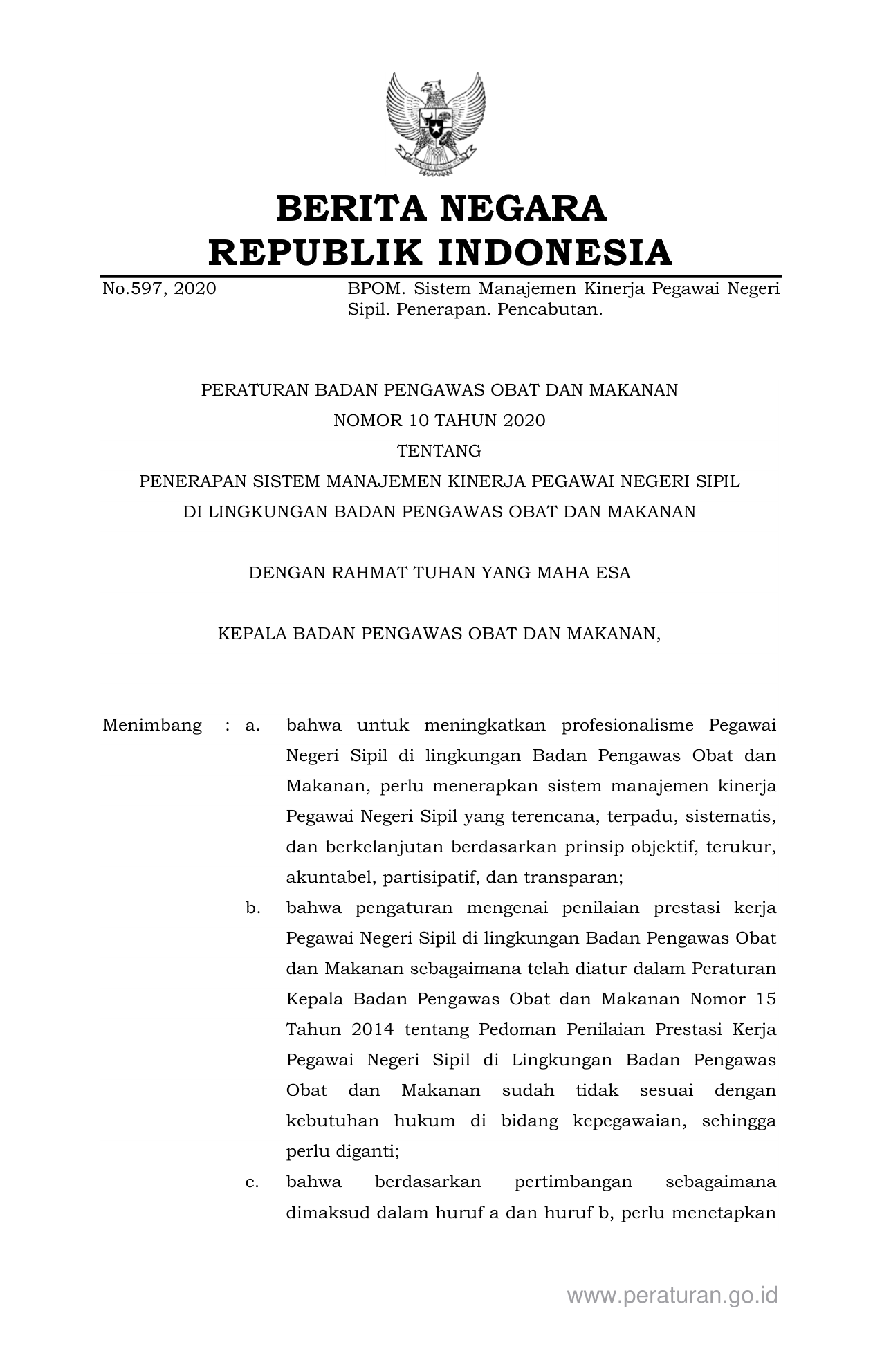 PERBAN Nomor 10 Tahun 2020 | Peraturan Badan Nomor 10 Tahun 2020 tentang PENERAPAN SISTEM MANAJEMEN KINERJA PEGAWAI NEGERI SIPIL DI LINGKUNGAN BADAN PENGAWAS OBAT DAN MAKANAN