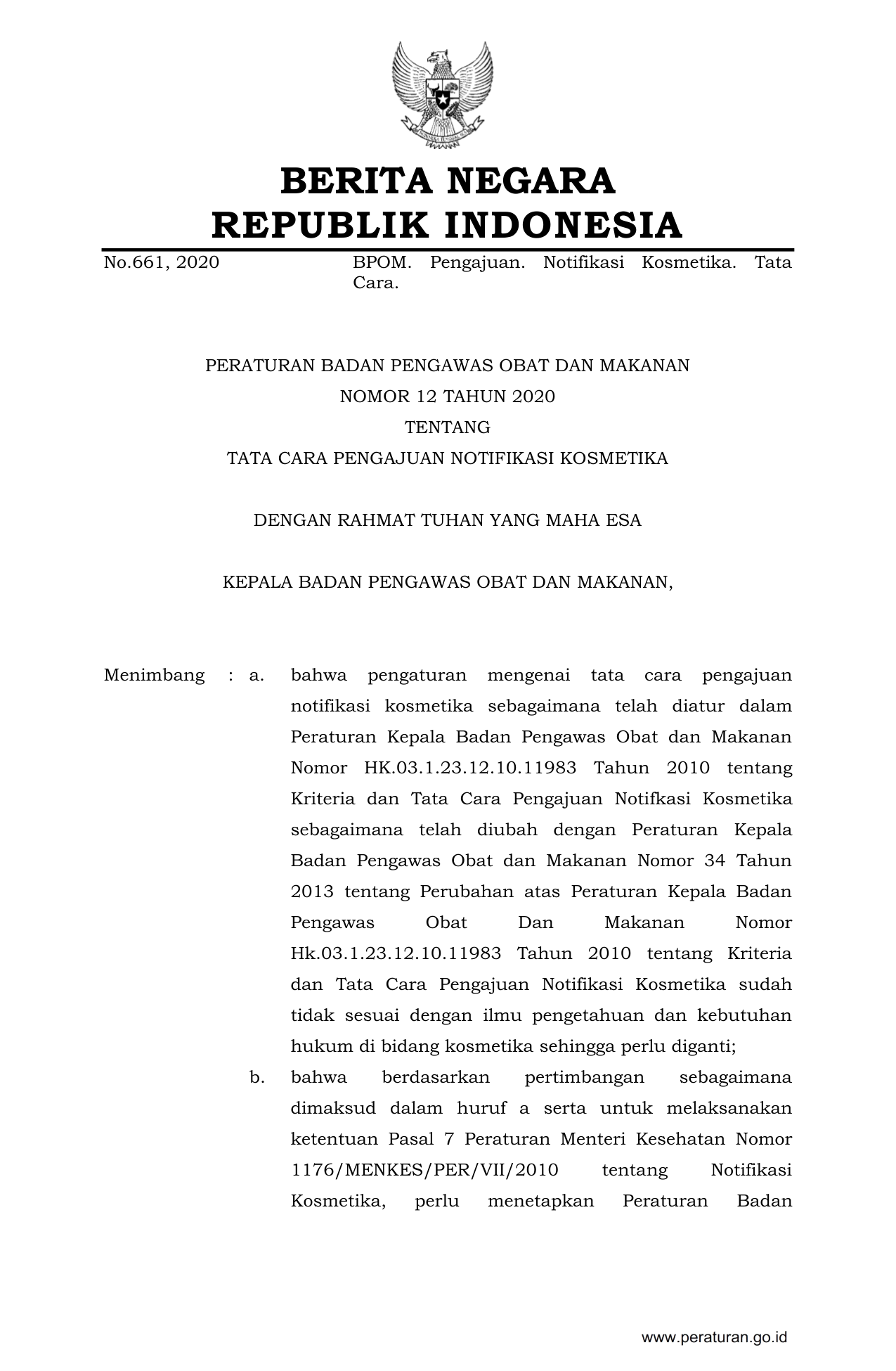PERBAN Nomor 12 Tahun 2020 | Peraturan Badan Nomor 12 Tahun 2020 tentang TATA CARA PENGAJUAN NOTIFIKASI KOSMETIKA