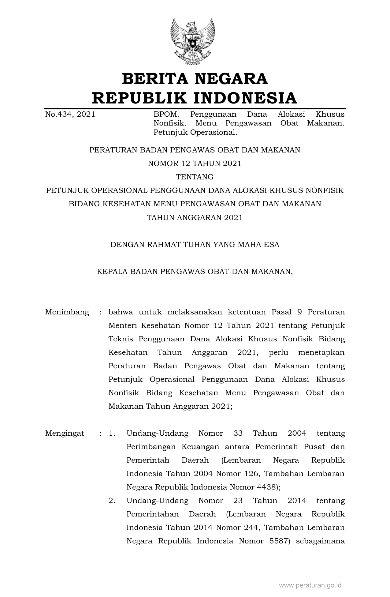 PERBAN Nomor 12 Tahun 2021 | Peraturan Badan Nomor 12 Tahun 2021 tentang PETUNJUK OPERASIONAL PENGGUNAAN DANA ALOKASI KHUSUS NONFISIK BIDANG KESEHATAN MENU PENGAWASAN OBAT DAN MAKANAN TAHUN ANGGARAN 2021