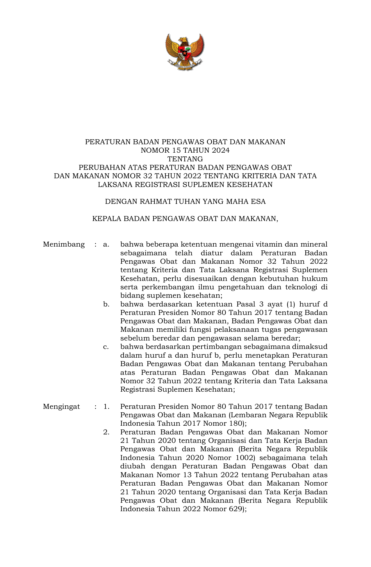 PERBAN Nomor 15 Tahun 2024 | Peraturan Badan Nomor 15 Tahun 2024 tentang Perubahan atas Peraturan Badan Pengawas Obat dan Makanan Nomor 32 Tahun 2022 tentang Kriteria dan Tata Laksana Registrasi Suplemen Kesehatan
