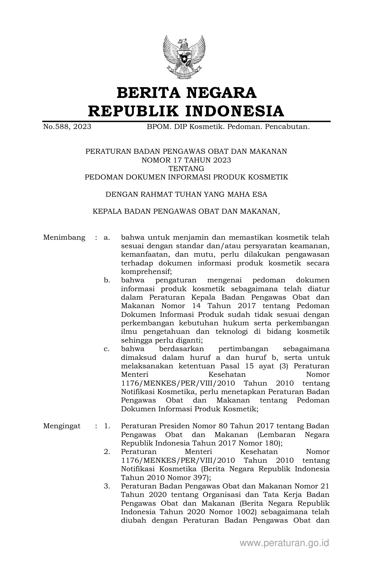 PERBAN Nomor 17 Tahun 2023 | Peraturan Badan Nomor 17 Tahun 2023 tentang PEDOMAN DOKUMEN INFORMASI PRODUK KOSMETIK