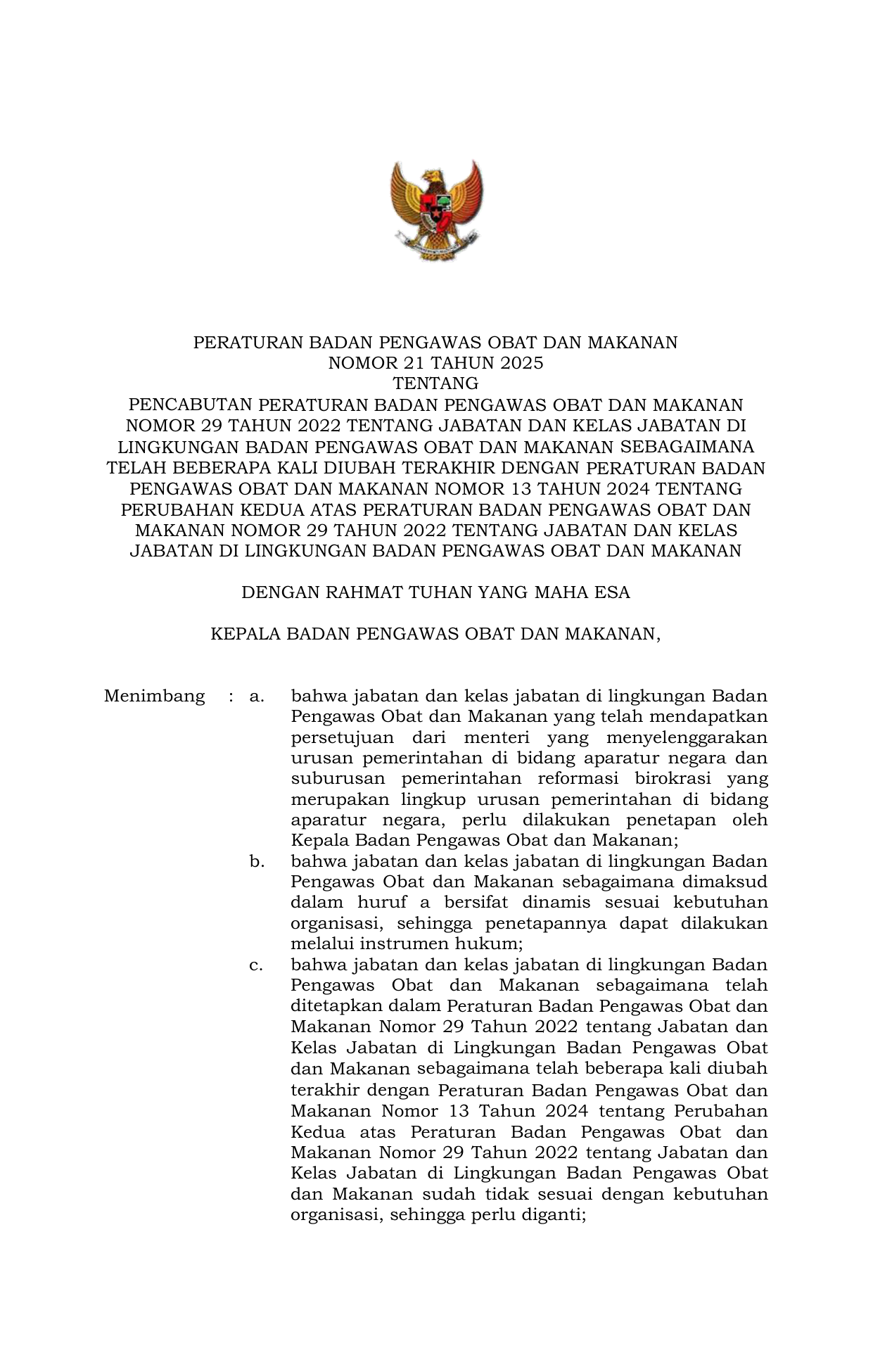 PERBAN Nomor 21 Tahun 2025 | Peraturan Badan Nomor 21 Tahun 2025 tentang Pencabutan Peraturan Badan Pengawas Obat dan Makanan Nomor 29 Tahun 2022 tentang Jabatan dan Kelas Jabatan di Lingkungan Badan Pengawas Obat dan Makanan sebagaimana telah beberapa kali diubah terakhir dengan Peraturan Badan Pengawas Obat dan Makanan Nomor 13 Tahun 2024 tentang Perubahan Kedua atas Peraturan Badan Pengawas Obat dan Makanan Nomor 29 Tahun 2022 tentang Jabatan dan Kelas Jabatan di Lingkungan Badan Pengawas Obat dan Makanan