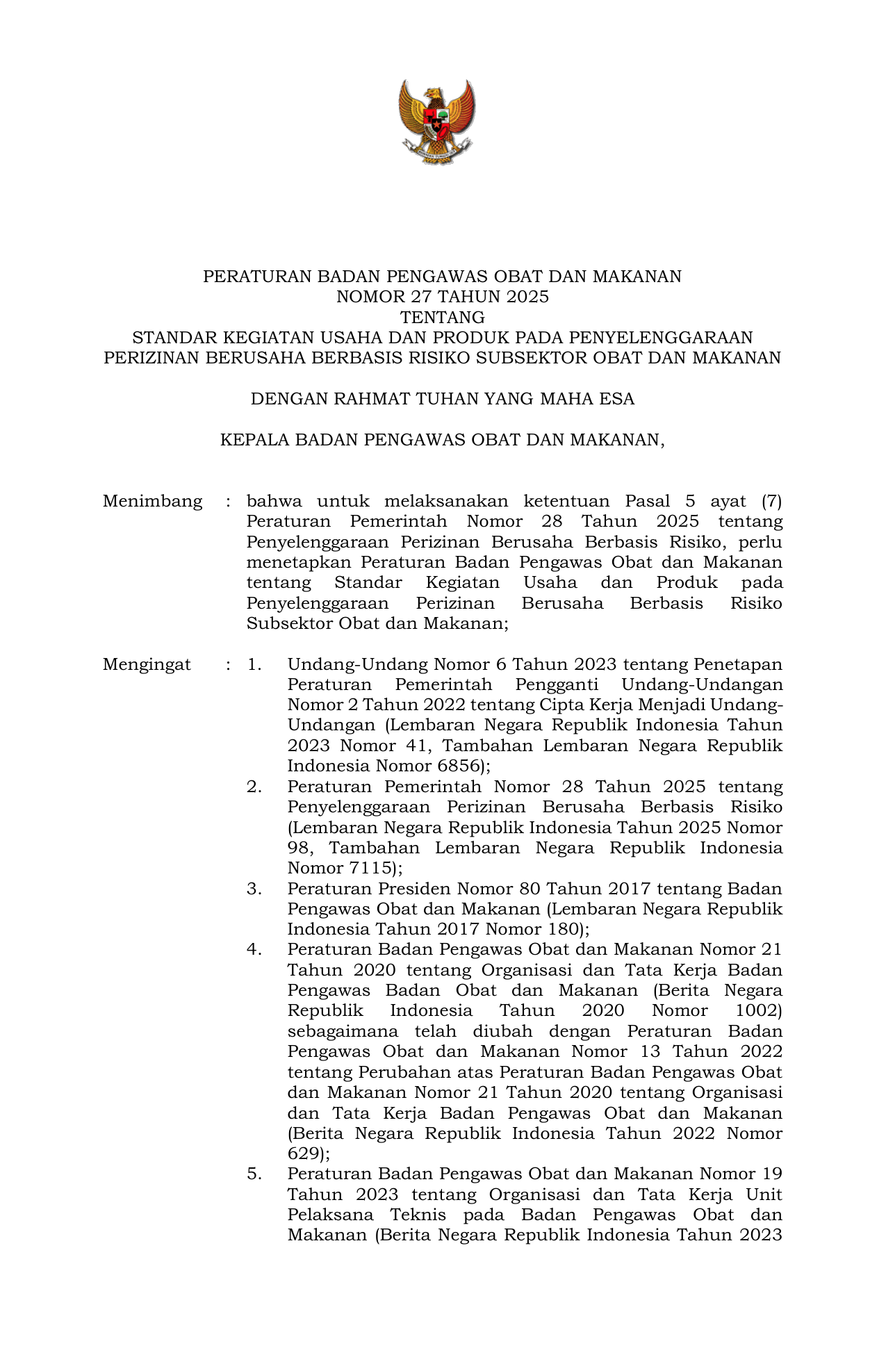 PERBAN Nomor 27 Tahun 2025 | Peraturan Badan Nomor 27 Tahun 2025 tentang Standar Kegiatan Usaha dan Produk pada Penyelenggaraan Perizinan Berusaha Berbasis Risiko Subsektor Obat dan Makanan