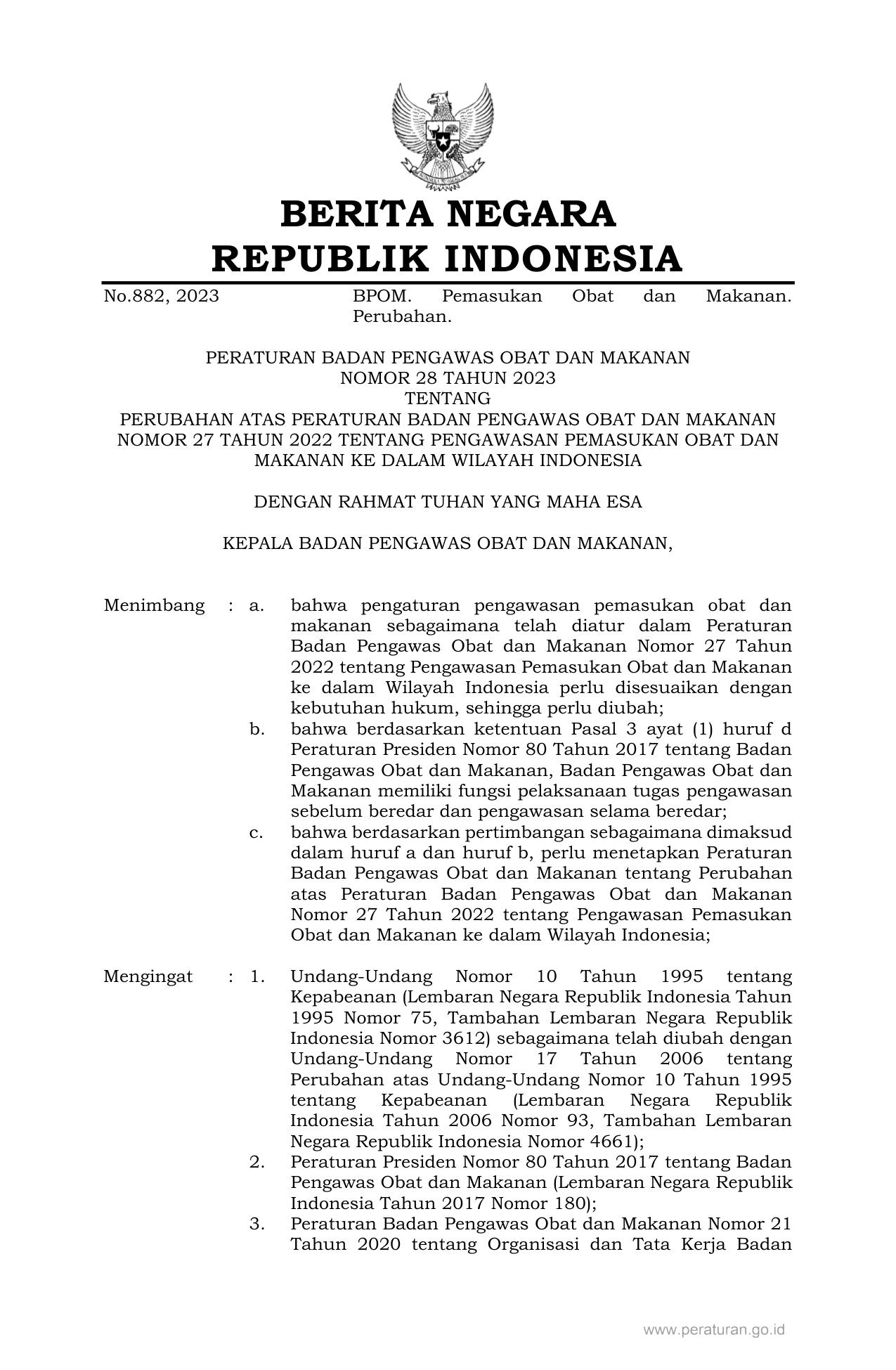 PERBAN Nomor 28 Tahun 2023 | Peraturan Badan Nomor 28 Tahun 2023 tentang PERUBAHAN ATAS PERATURAN BADAN PENGAWAS OBAT DAN MAKANAN NOMOR 27 TAHUN 2022 TENTANG PENGAWASAN PEMASUKAN OBAT DAN MAKANAN KE DALAM WILAYAH INDONESIA