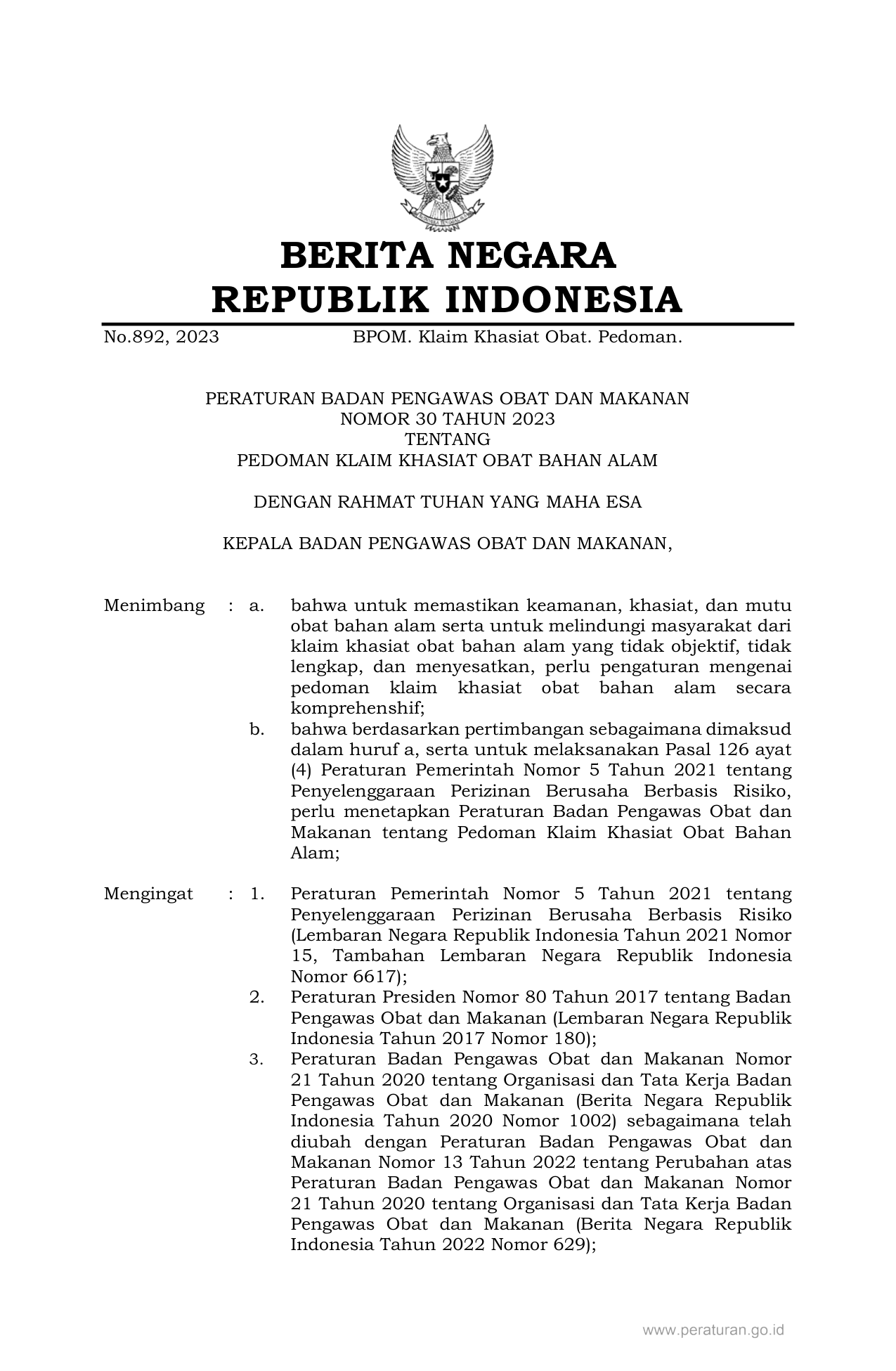 PERBAN Nomor 30 Tahun 2023 | Peraturan Badan Nomor 30 Tahun 2023 tentang PEDOMAN KLAIM KHASIAT OBAT BAHAN ALAM