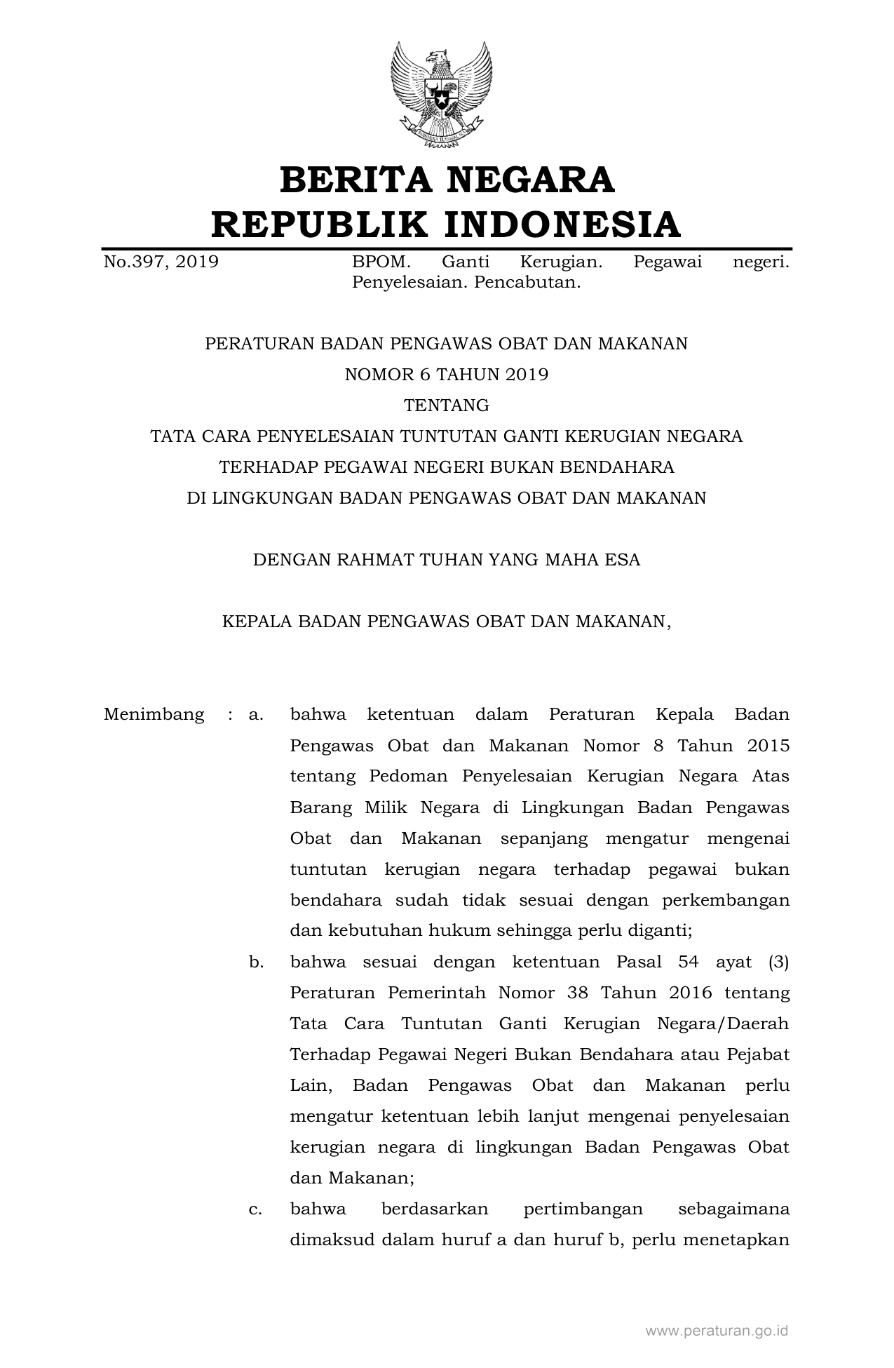 PERBAN Nomor 6 Tahun 2019 | Peraturan Badan Nomor 6 Tahun 2019 tentang TATA CARA PENYELESAIAN TUNTUTAN GANTI KERUGIAN NEGARA TERHADAP PEGAWAI NEGERI BUKAN BENDAHARA DI LINGKUNGAN BADAN PENGAWAS OBAT DAN MAKANAN