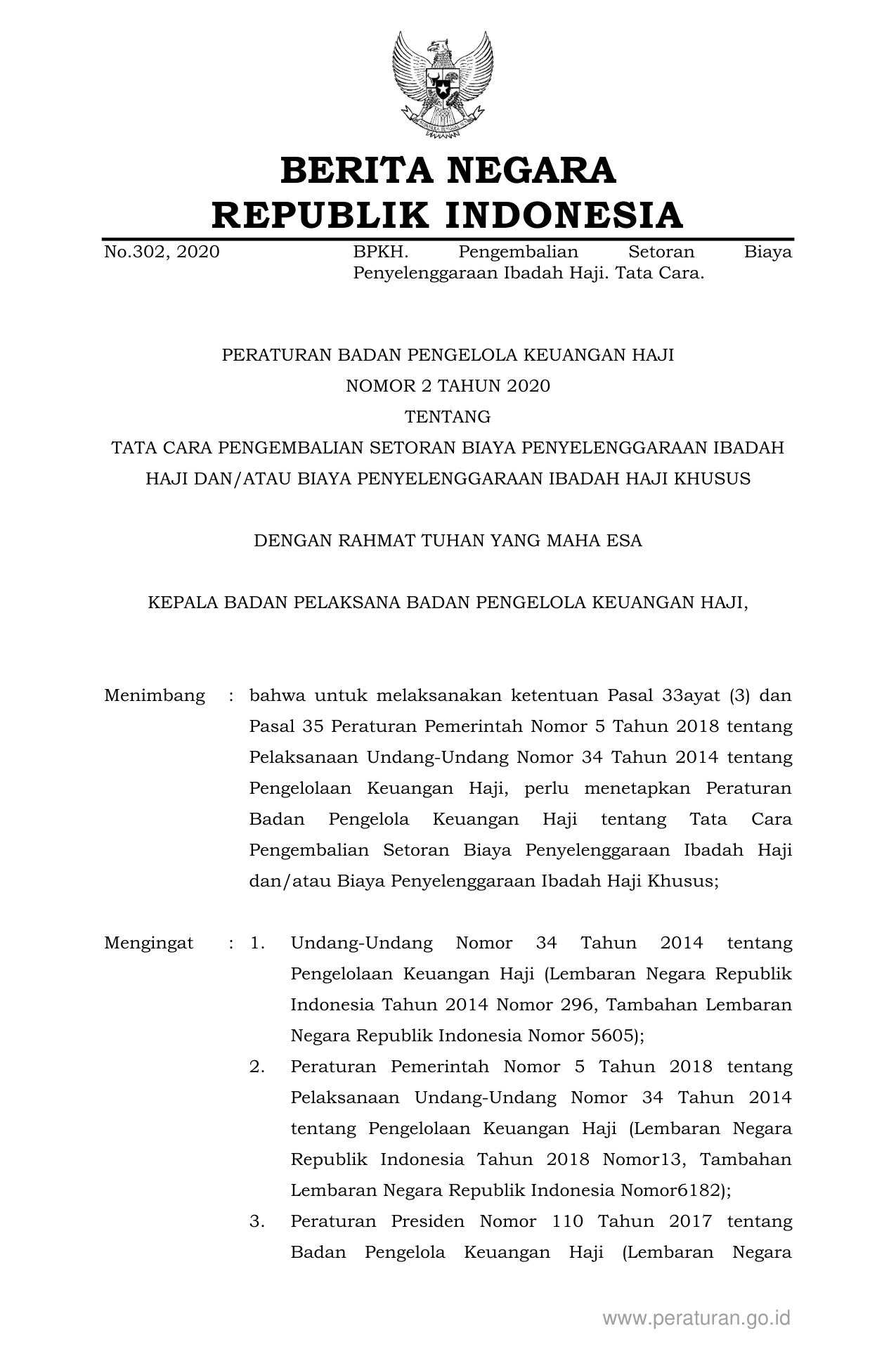 PERBAN Nomor 2 Tahun 2020 | Peraturan Badan Nomor 2 Tahun 2020 tentang TATA CARA PENGEMBALIAN SETORAN BIAYA PENYELENGGARAAN IBADAH HAJI DAN/ATAU BIAYA PENYELENGGARAAN IBADAH HAJI KHUSUS