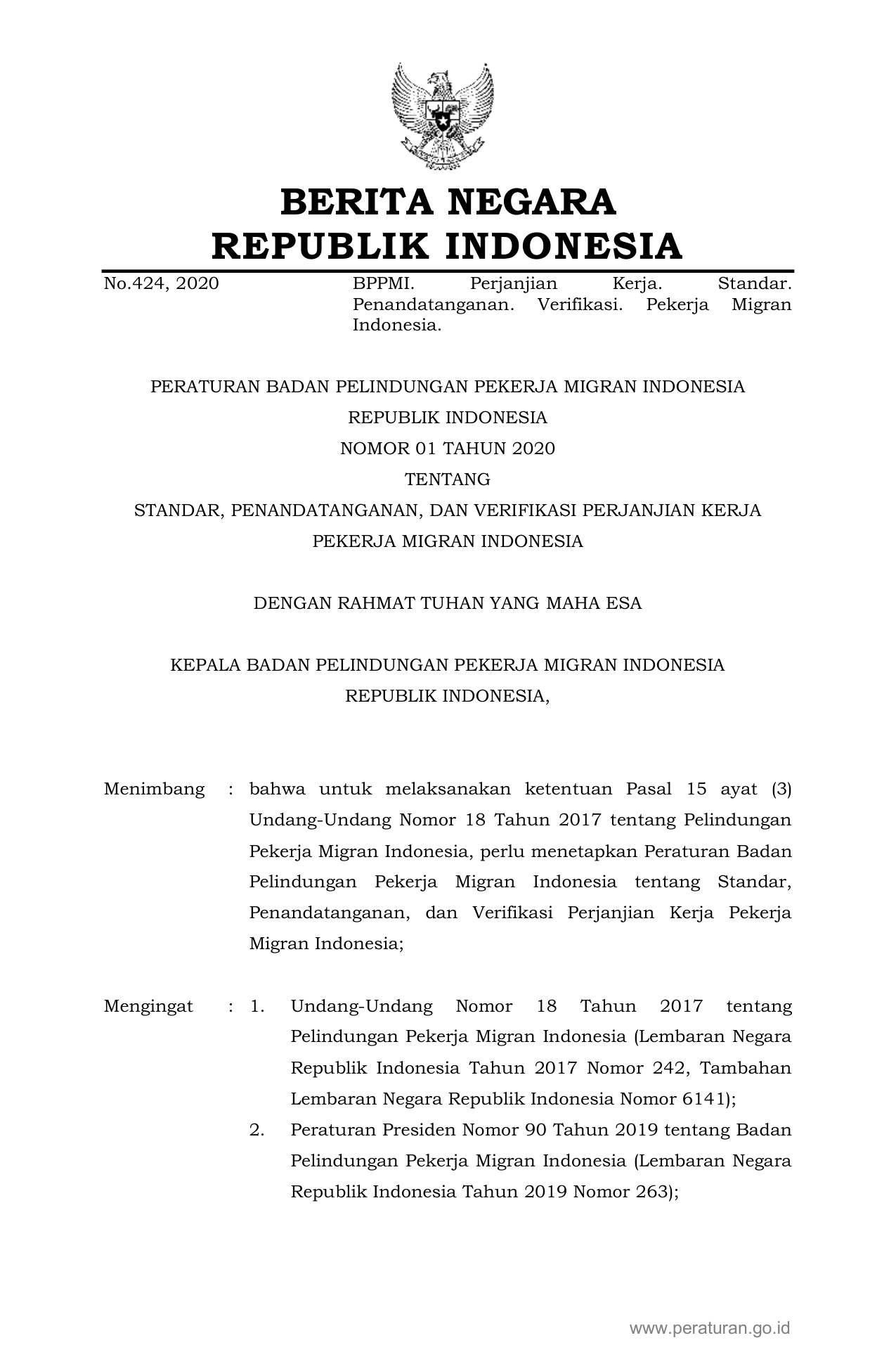 PERBAN Nomor 01 Tahun 2020 | Peraturan Badan Nomor 01 Tahun 2020 tentang STANDAR, PENANDATANGANAN, DAN VERIFIKASI PERJANJIAN KERJA PEKERJA MIGRAN INDONESIA