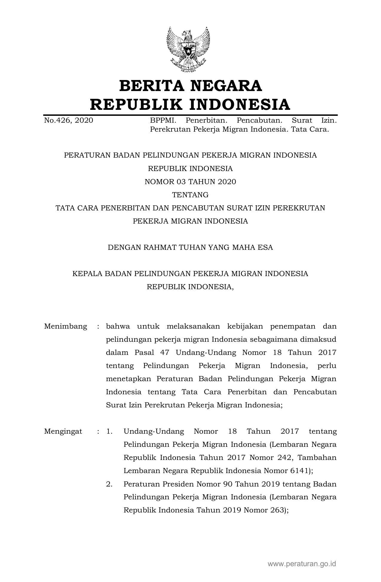 PERBAN Nomor 03 Tahun 2020 | Peraturan Badan Nomor 03 Tahun 2020 tentang TATA CARA PENERBITAN DAN PENCABUTAN SURAT IZIN PEREKRUTAN PEKERJA MIGRAN INDONESIA