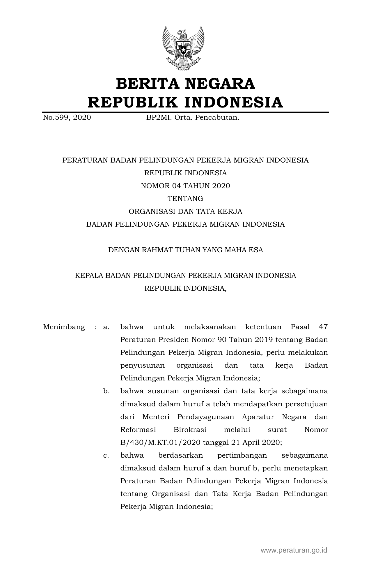 PERBAN Nomor 04 Tahun 2020 | Peraturan Badan Nomor 04 Tahun 2020 tentang ORGANISASI DAN TATA KERJA BADAN PELINDUNGAN PEKERJA MIGRAN INDONESIA