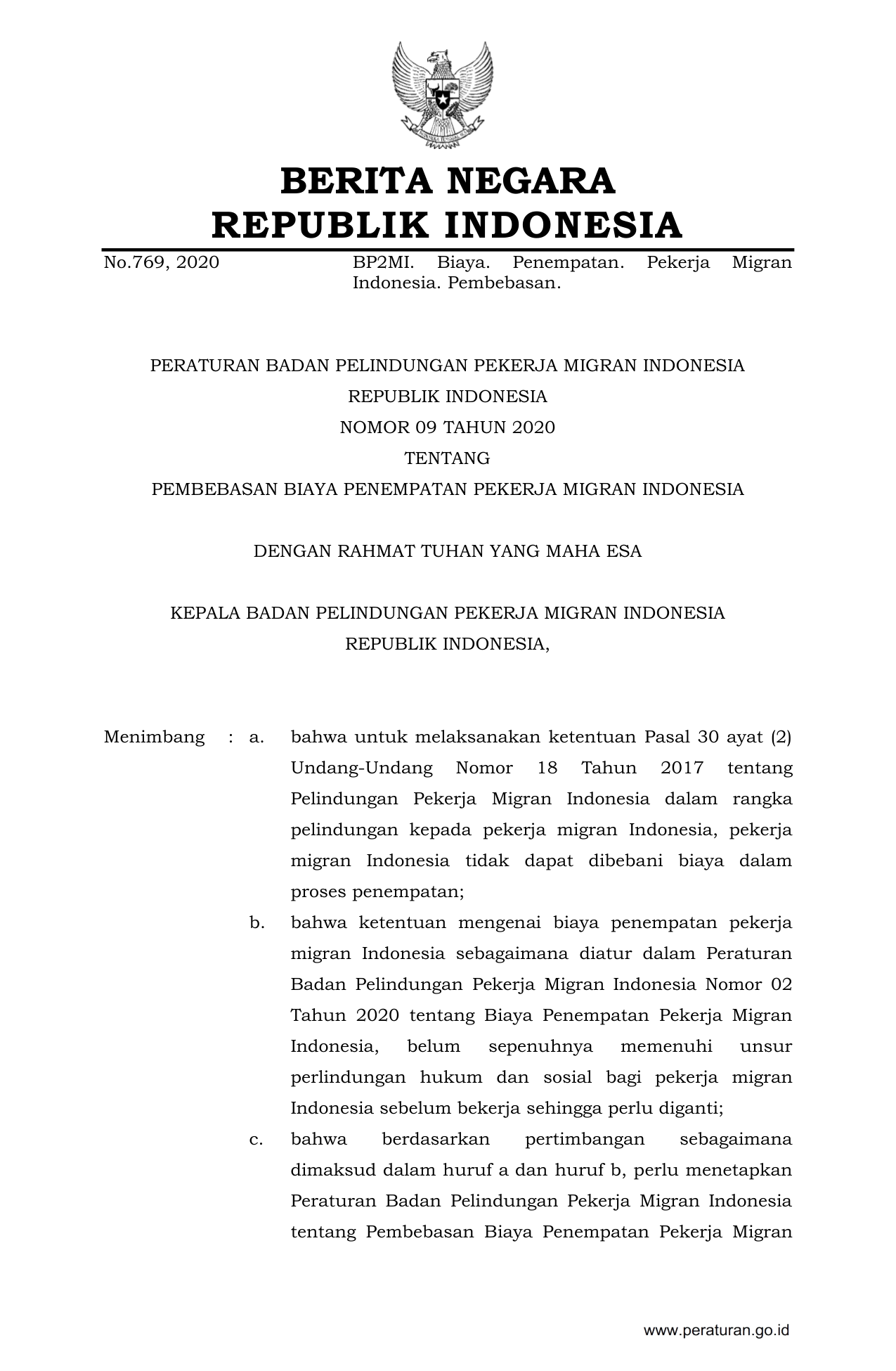 PERBAN Nomor 09 Tahun 2020 | Peraturan Badan Nomor 09 Tahun 2020 tentang PEMBEBASAN BIAYA PENEMPATAN PEKERJA MIGRAN INDONESIA