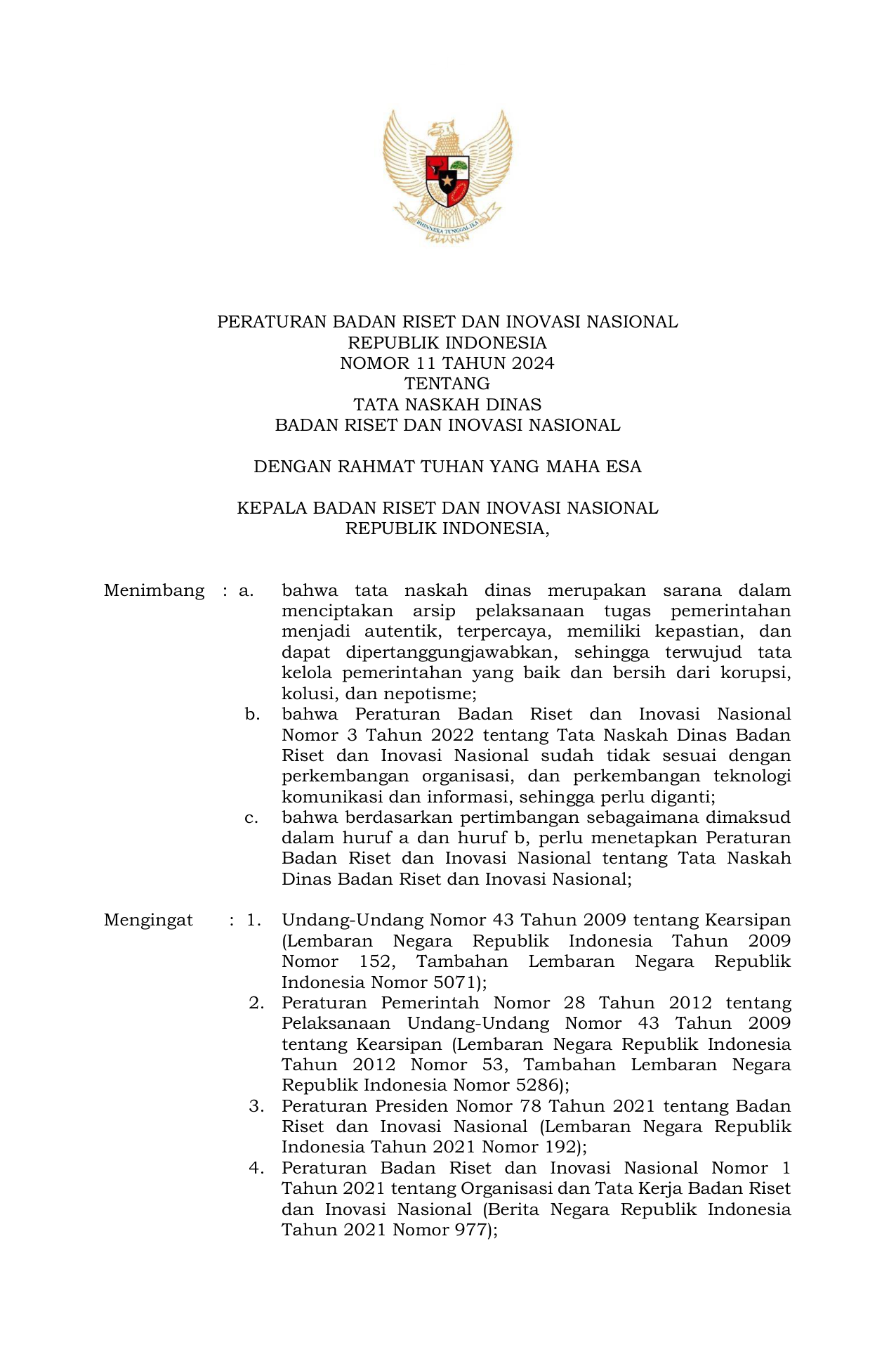 PERBAN Nomor 11 Tahun 2024 | Peraturan Badan Nomor 11 Tahun 2024 tentang Tata Naskah Dinas Badan Riset dan Inovasi Nasional