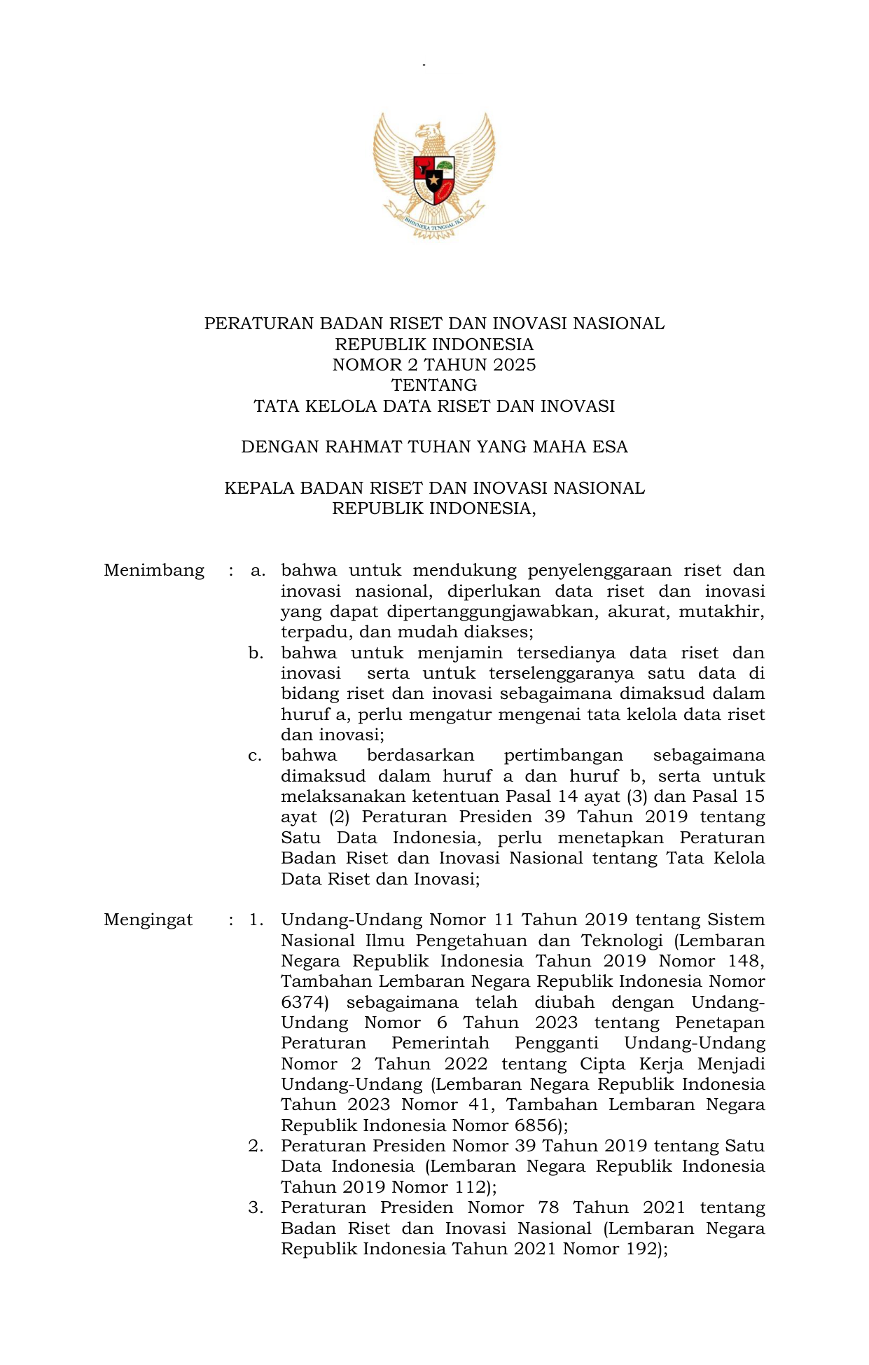 PERBAN Nomor 2 Tahun 2025 | Peraturan Badan Nomor 2 Tahun 2025 tentang Tata Kelola Data Riset dan Inovasi