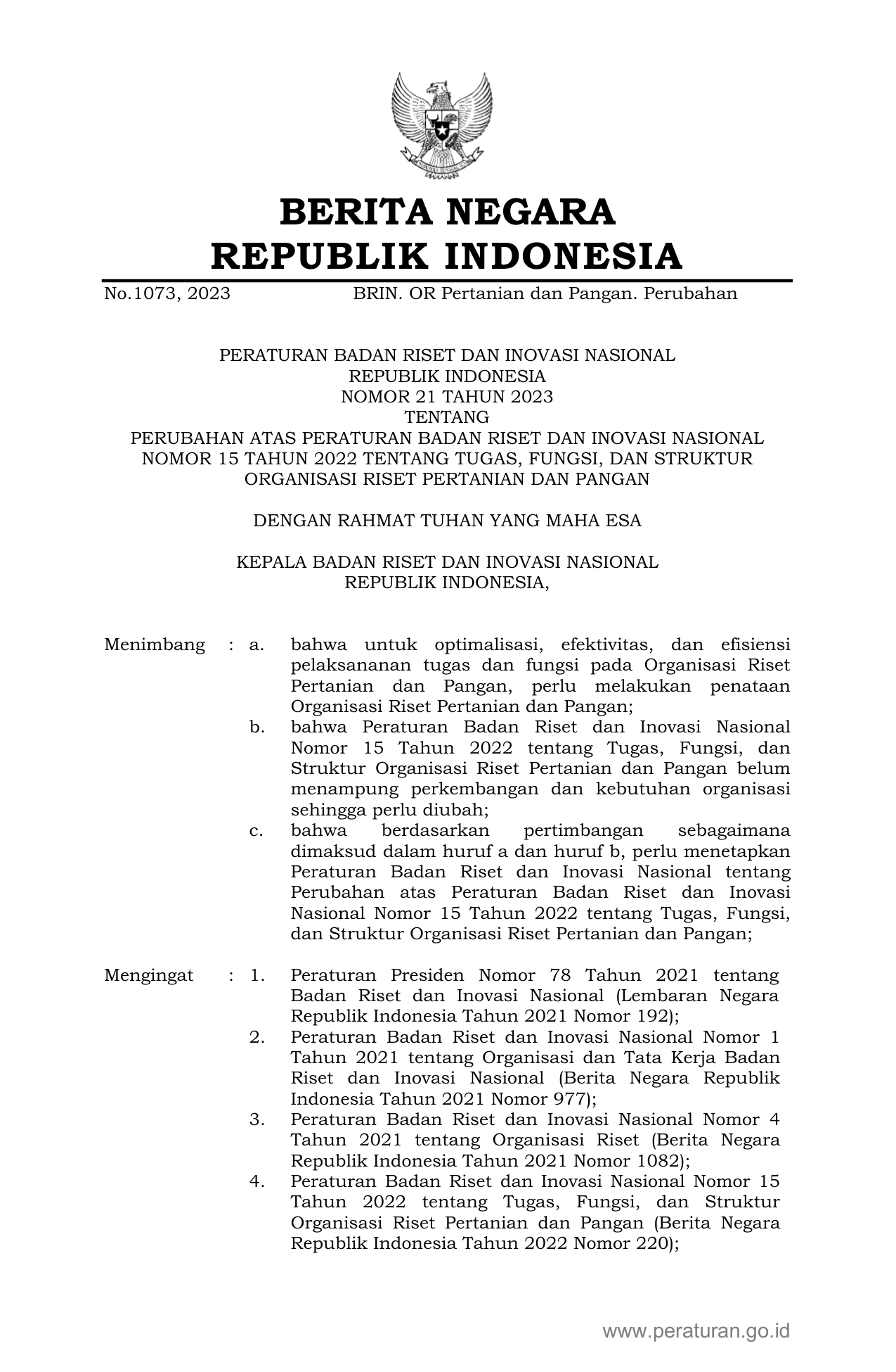 PERBAN Nomor 21 Tahun 2023 | Peraturan Badan Nomor 21 Tahun 2023 tentang PERUBAHAN ATAS PERATURAN BADAN RISET DAN INOVASI NASIONAL NOMOR 15 TAHUN 2022 TENTANG TUGAS, FUNGSI, DAN STRUKTUR ORGANISASI RISET PERTANIAN DAN PANGAN