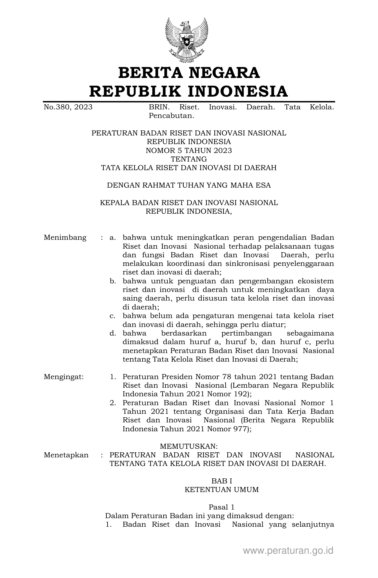 PERBAN Nomor 5 Tahun 2023 | Peraturan Badan Nomor 5 Tahun 2023 tentang TATA KELOLA RISET DAN INOVASI DI DAERAH