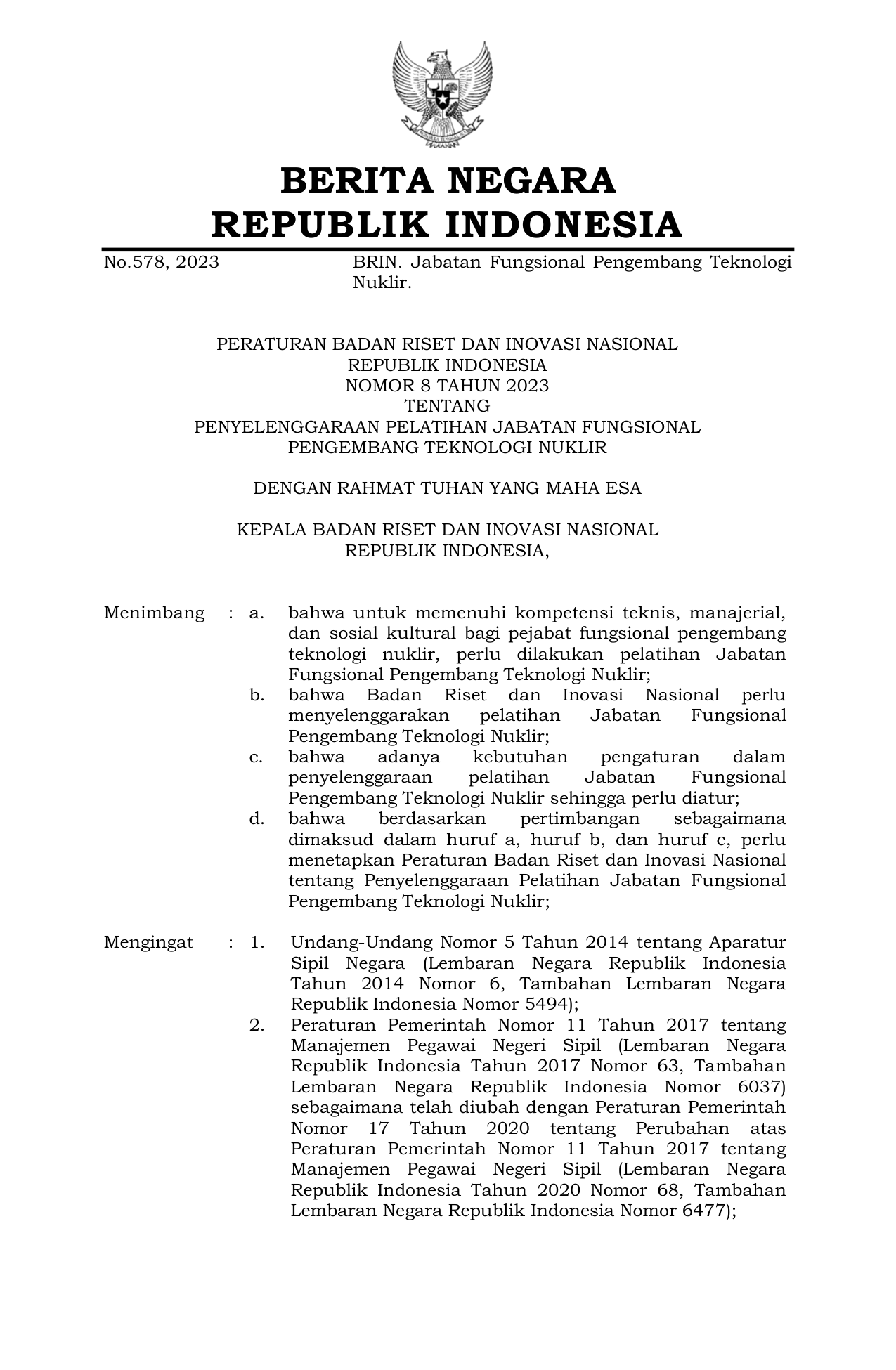 PERBAN Nomor 8 Tahun 2023 | Peraturan Badan Nomor 8 Tahun 2023 tentang PENYELENGGARAAN PELATIHAN JABATAN FUNGSIONAL PENGEMBANG TEKNOLOGI NUKLIR