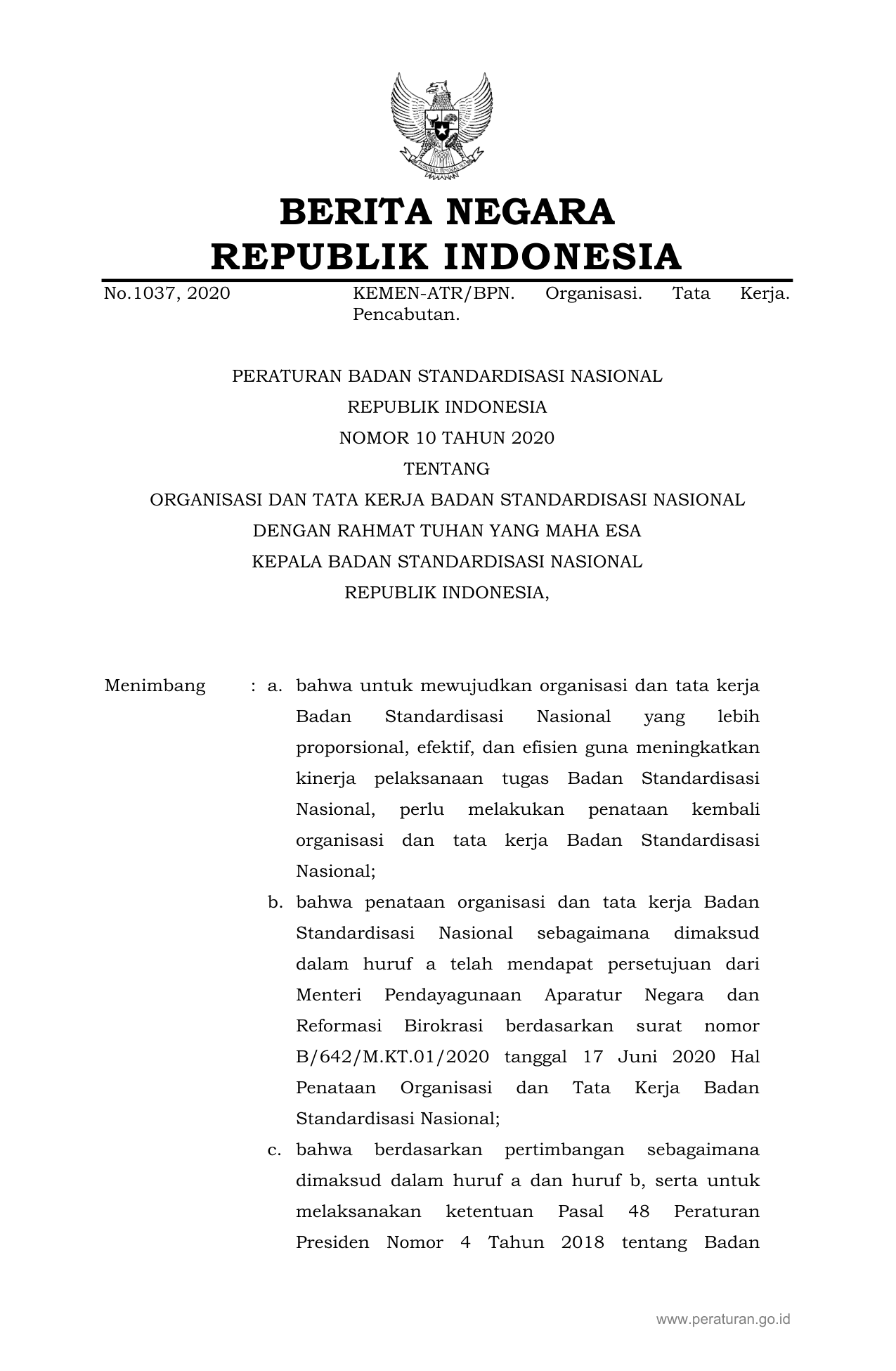PERBAN Nomor 10 Tahun 2020 | Peraturan Badan Nomor 10 Tahun 2020 tentang ORGANISASI DAN TATA KERJA BADAN STANDARDISASI NASIONAL