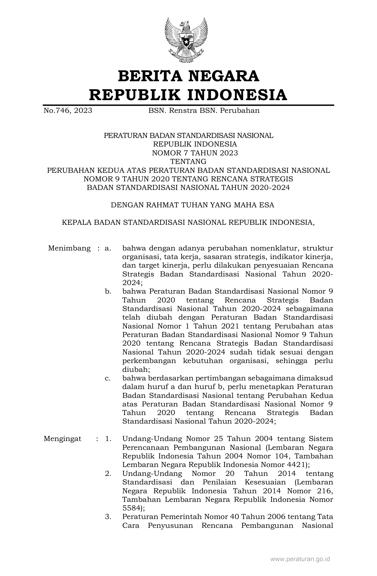 PERBAN Nomor 7 Tahun 2023 | Peraturan Badan Nomor 7 Tahun 2023 tentang PERUBAHAN KEDUA ATAS PERATURAN BADAN STANDARDISASI NASIONAL NOMOR 9 TAHUN 2020 TENTANG RENCANA STRATEGIS BADAN STANDARDISASI NASIONAL TAHUN 2020-2024