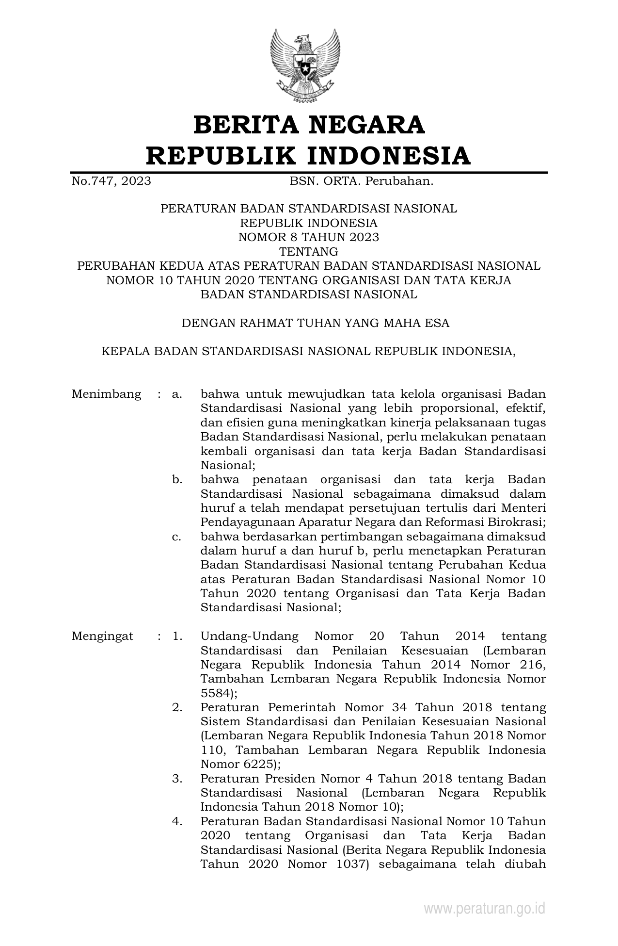 PERBAN Nomor 8 Tahun 2023 | Peraturan Badan Nomor 8 Tahun 2023 tentang PERUBAHAN KEDUA ATAS PERATURAN BADAN STANDARDISASI NASIONAL NOMOR 10 TAHUN 2020 TENTANG ORGANISASI DAN TATA KERJA BADAN STANDARDISASI NASIONAL