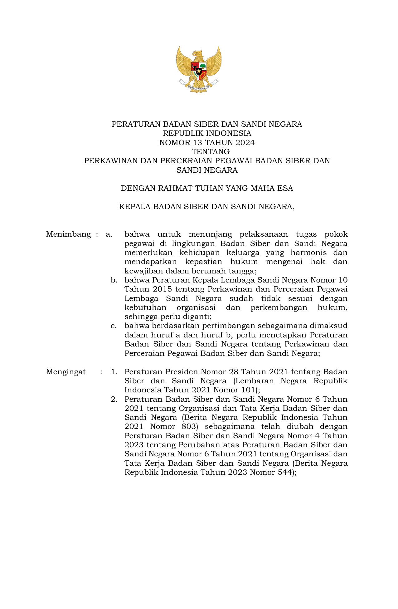 PERBAN Nomor 13 Tahun 2024 | Peraturan Badan Nomor 13 Tahun 2024 tentang Perkawinan dan Perceraian Pegawai Badan Siber dan Sandi Negara