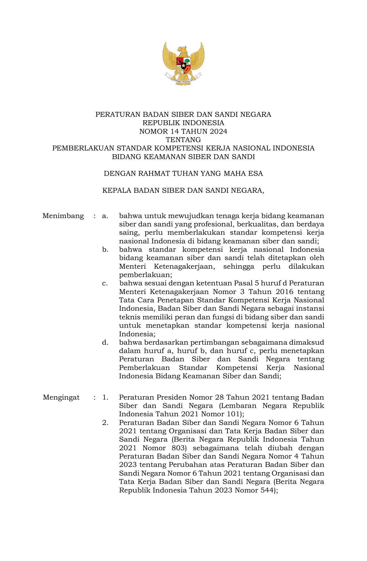 PERBAN Nomor 14 Tahun 2024 | Peraturan Badan Nomor 14 Tahun 2024 tentang Pemberlakuan Standar Kompetensi Kerja Nasional Indonesia Bidang Keamanan Siber dan Sandi