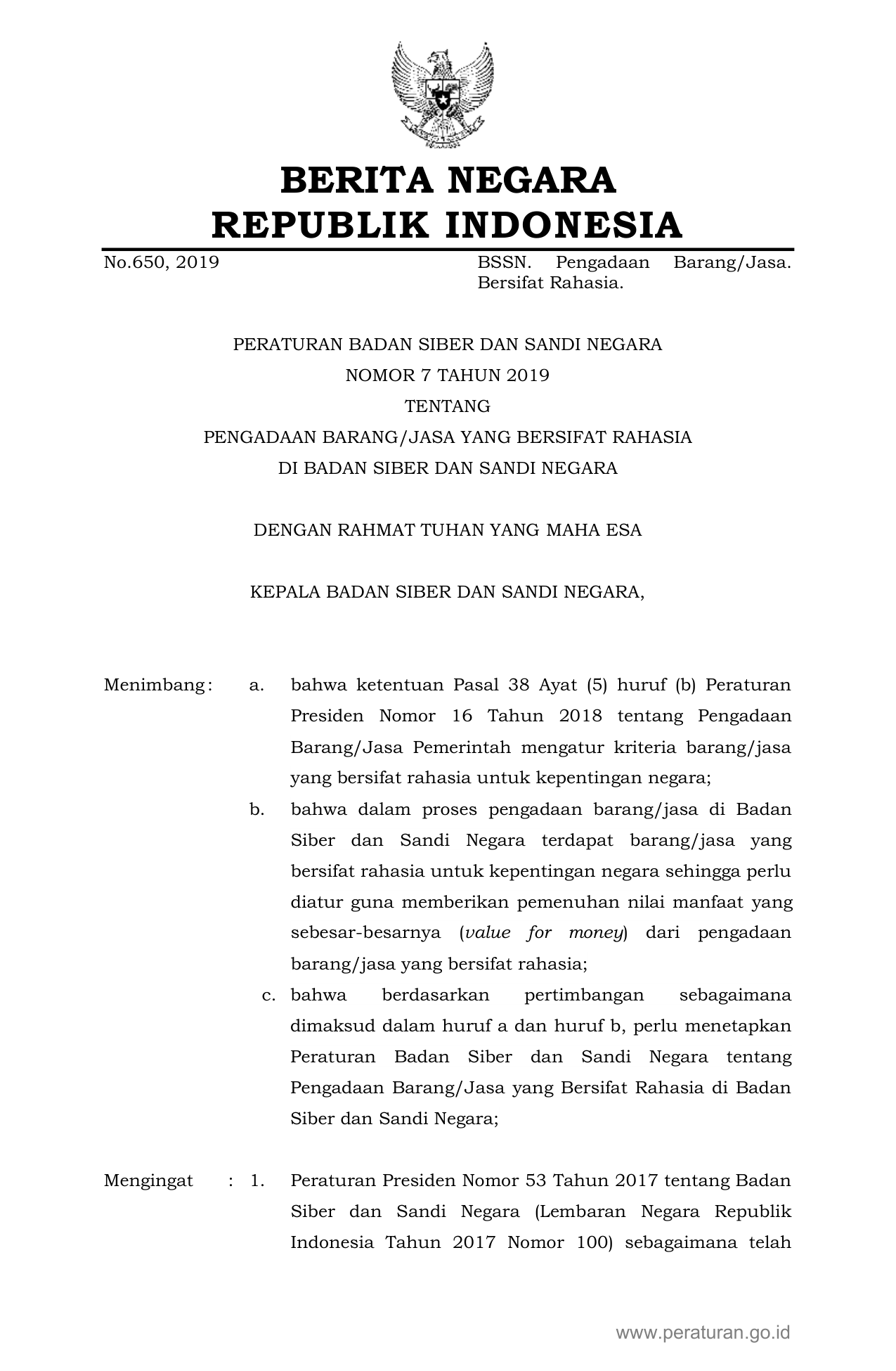 PERBAN Nomor 7 Tahun 2019 | Peraturan Badan Nomor 7 Tahun 2019 tentang PENGADAAN BARANG/JASA YANG BERSIFAT RAHASIA DI BADAN SIBER DAN SANDI NEGARA