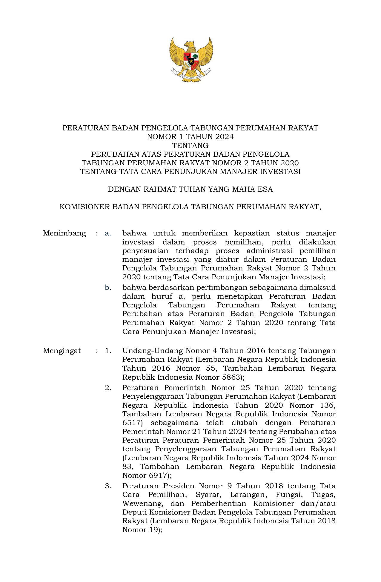 PERBAN Nomor 1 Tahun 2024 | Peraturan Badan Nomor 1 Tahun 2024 tentang PERUBAHAN ATAS PERATURAN BADAN PENGELOLA TABUNGAN PERUMAHAN RAKYAT NOMOR 2 TAHUN 2020 TENTANG TATA CARA PENUNJUKAN MANAJER INVESTASI