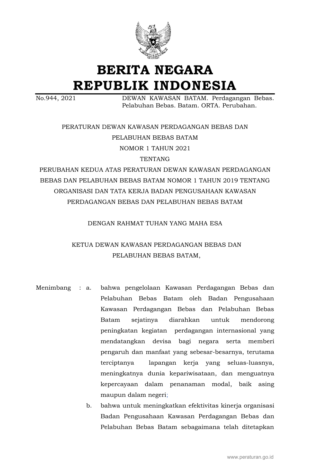PERBAN Nomor 1 Tahun 2021 | Peraturan Badan Nomor 1 Tahun 2021 tentang PERUBAHAN KEDUA ATAS PERATURAN DEWAN KAWASAN PERDAGANGAN BEBAS DAN PELABUHAN BEBAS BATAM NOMOR 1 TAHUN 2019 TENTANG ORGANISASI DAN TATA KERJA BADAN PENGUSAHAAN KAWASAN PERDAGANGAN BEBAS DAN PELABUHAN BEBAS BATAM