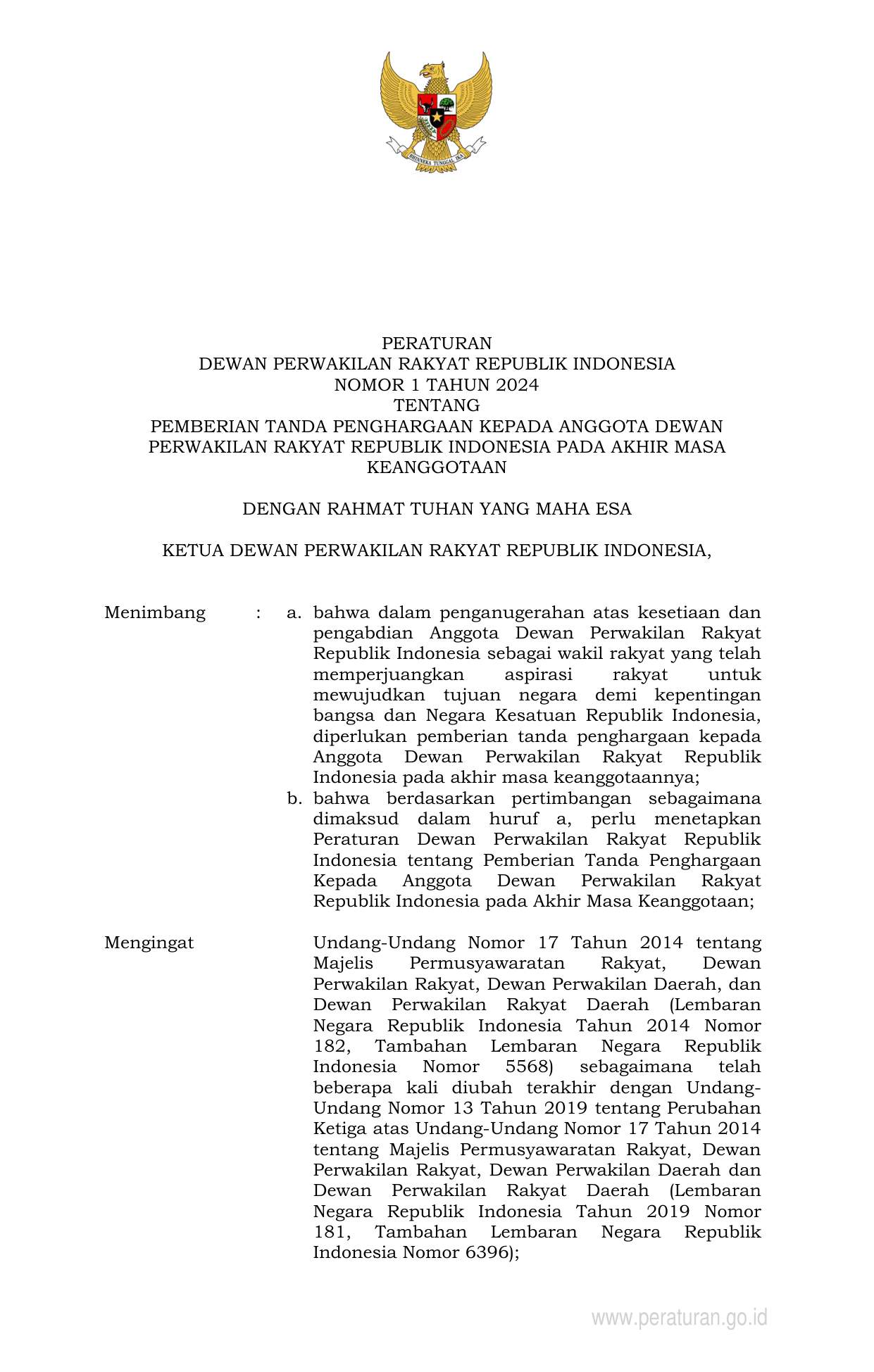 PERBAN Nomor 1 Tahun 2024 | Peraturan Badan Nomor 1 Tahun 2024 tentang PEMBERIAN TANDA PENGHARGAAN KEPADA ANGGOTA DEWAN PERWAKILAN RAKYAT REPUBLIK INDONESIA PADA AKHIR MASA KEANGGOTAAN