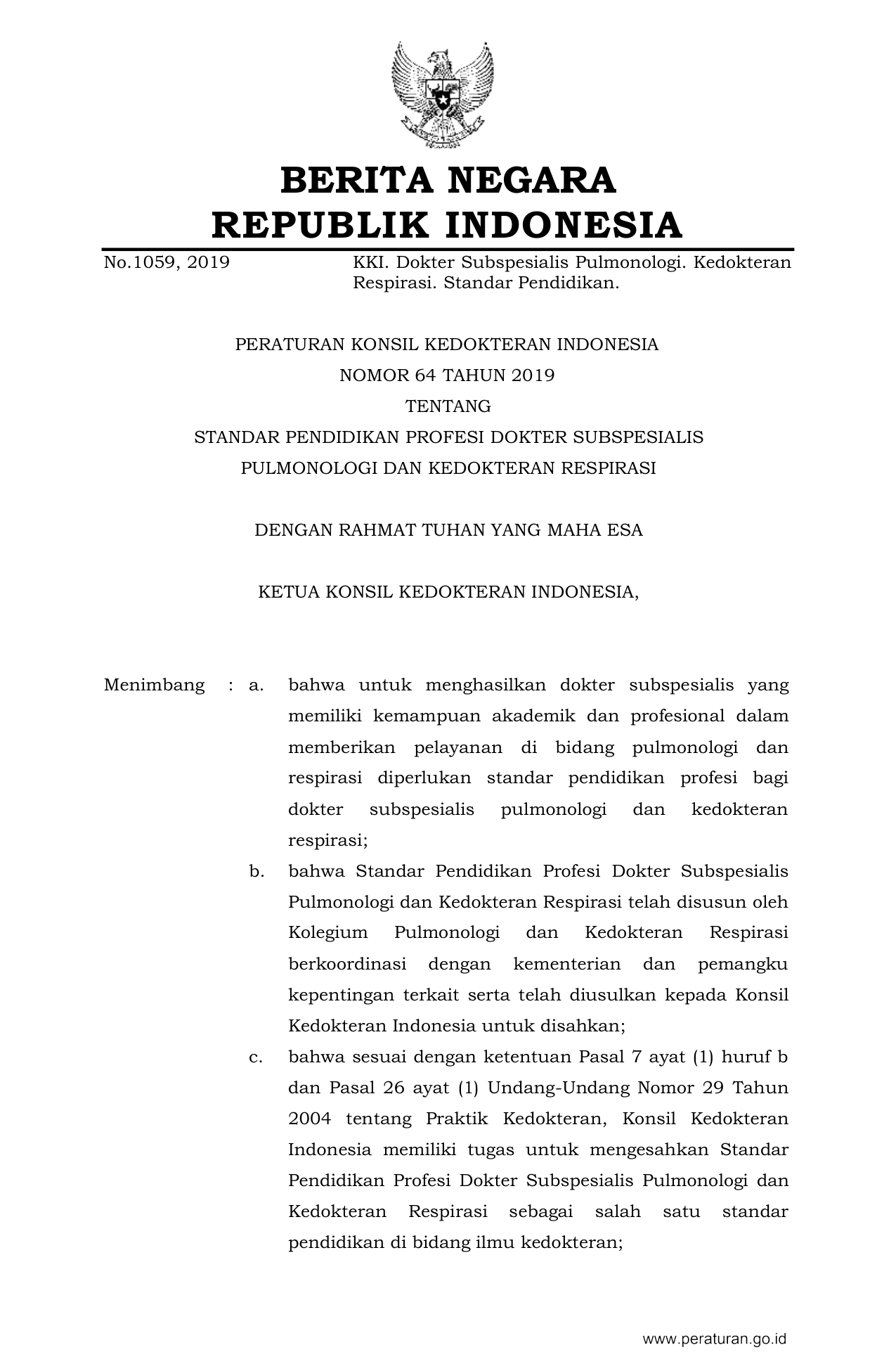 PERBAN Nomor 64 Tahun 2019 | Peraturan Badan Nomor 64 Tahun 2019 tentang STANDAR PENDIDIKAN PROFESI DOKTER SUBSPESIALIS PULMONOLOGI DAN KEDOKTERAN RESPIRASI