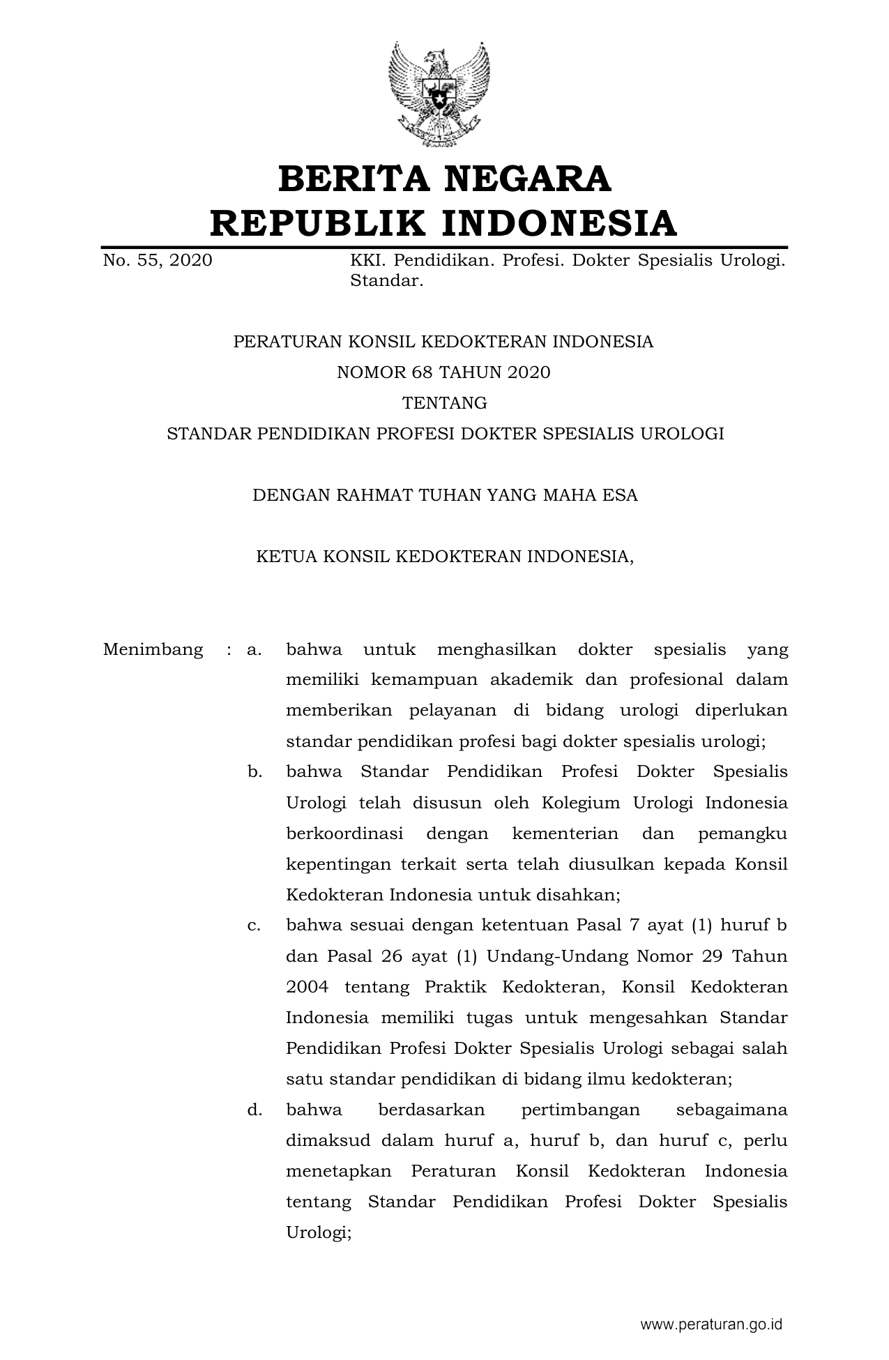 PERBAN Nomor 68 Tahun 2020 | Peraturan Badan Nomor 68 Tahun 2020 tentang STANDAR PENDIDIKAN PROFESI DOKTER SPESIALIS UROLOGI